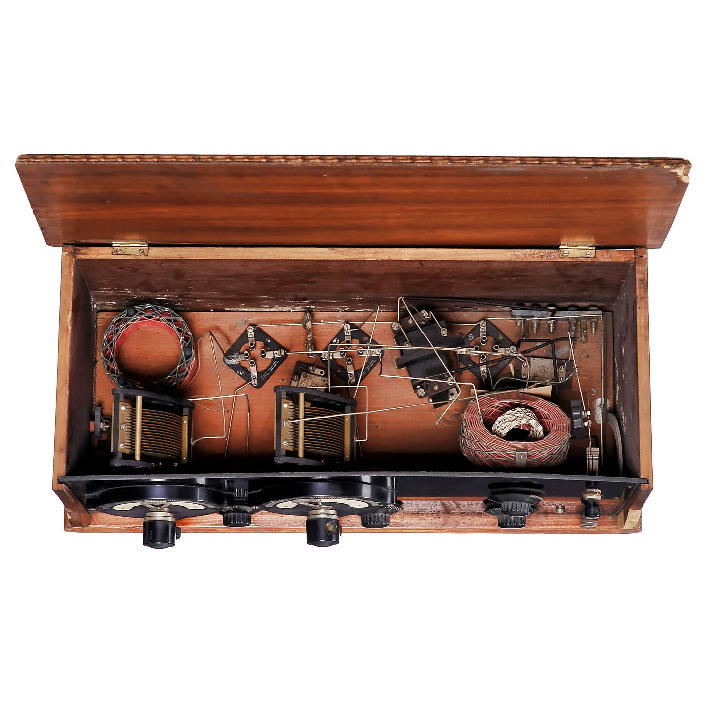 1) France, 6 tubes (5 missing), battery-operated, oak case, width 23 in. – 2) Germany, 4 tubes (1 missing), battery-operated, oak case, width 23 ½ in., other components missing, lid loose. – 3) Germany, 3 tubes (missing), battery-operated, wood case, width 22 in. – And: 4) England, 3 tubes (missing), battery-operated, oak case, width 21 in.