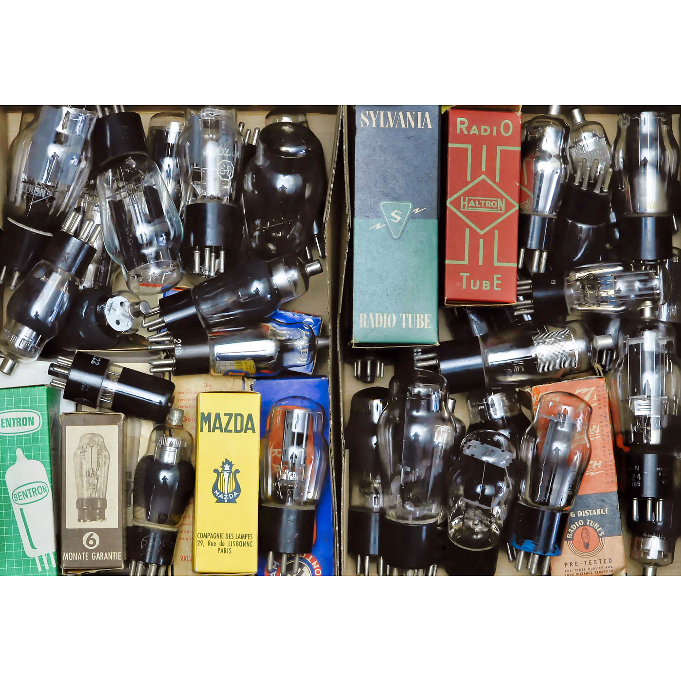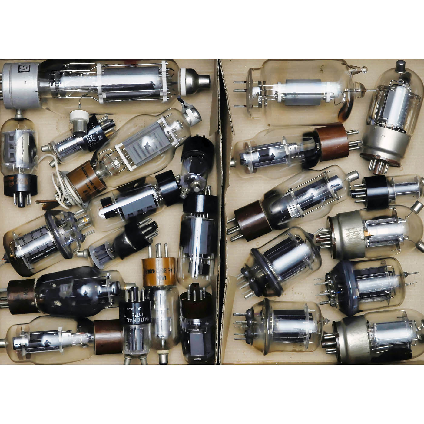 1) 24 transmitter tubes: 815 – RK-829 – 807 – 6DQ5 – 60Q6B – 6L6WGB – CV1135 – 812 – 810 – 7193 and others. – 2) Approx. 430 electron tubes (only a selection listed): 32 – 80 – 75 – 77 – 27 – 42 – 78 – 76 – 53 – 57 – 5Z3 – 2W3 – 5Y3 – 5Z4G – 6M6 – 6V6 – 6A7 – 6SR7 – 6AG7 – 6SL7 – 12J5 – SY224 – Y2E – 2A3 – 551 – 2A7 – VT150 – VT165 – VT164 – J5WG – UX245 – O247 – 2X2A – 2050A – 3B24 – 6L7G – 6SC7 – 6SK7 – 6E8G – 5U4 – 6D6 – 25L6 – 35/51 – 25Z5 – 6A6 – 6C6 – 6B7 – 6D6 – 6SA7 – 6B8 – 5V4 – 6SN7GT – 6SK7 – 6B5 – VT145 – 25Z5 – 6F8G – VR90. – 3) 12 Klystrons. – 4) 25 relays. – And: 5) Approx. 50 electronic resistors. – Including 15 English tubes: KT2 – MHD4 – VR65 – VT501 – KC1 – VT126 – DL63 – KTW61 – SP13 – Ar21 – VR54.