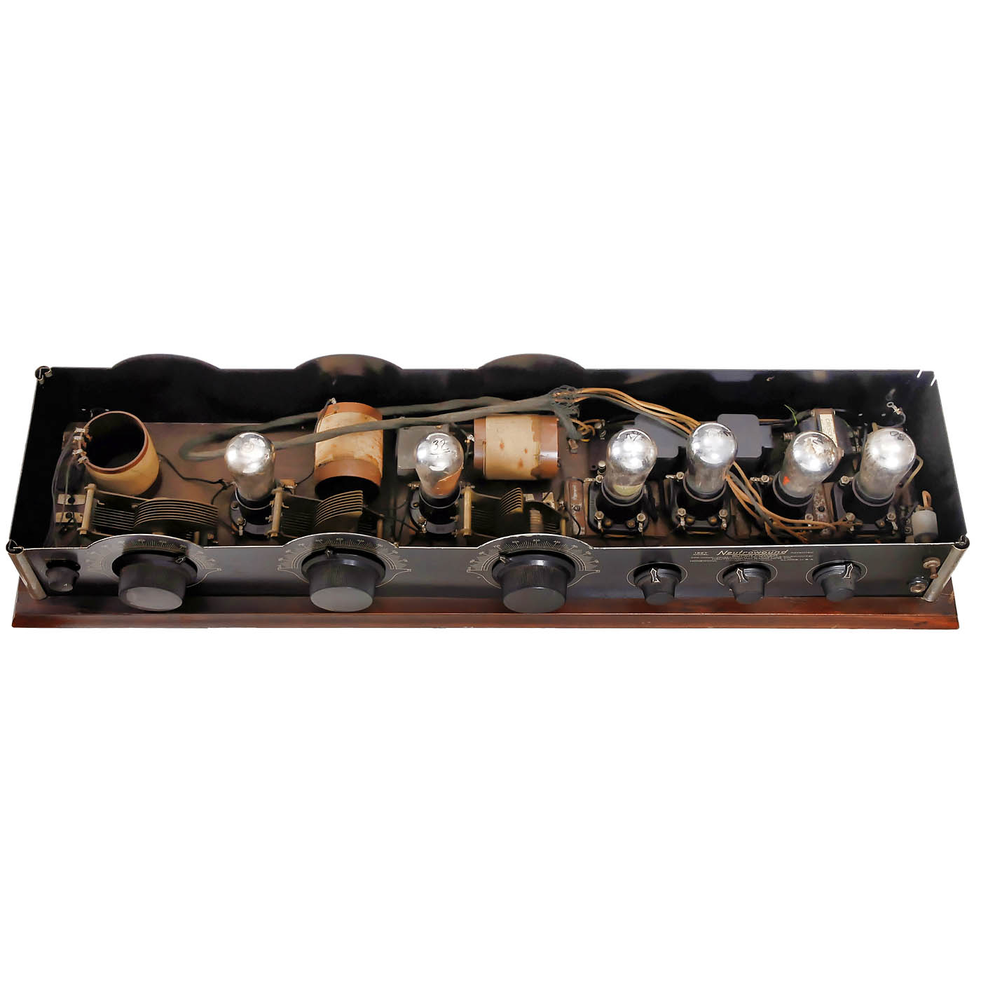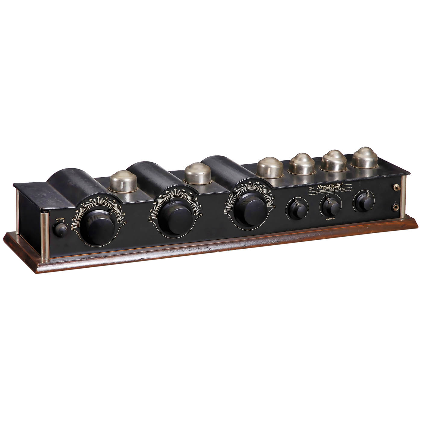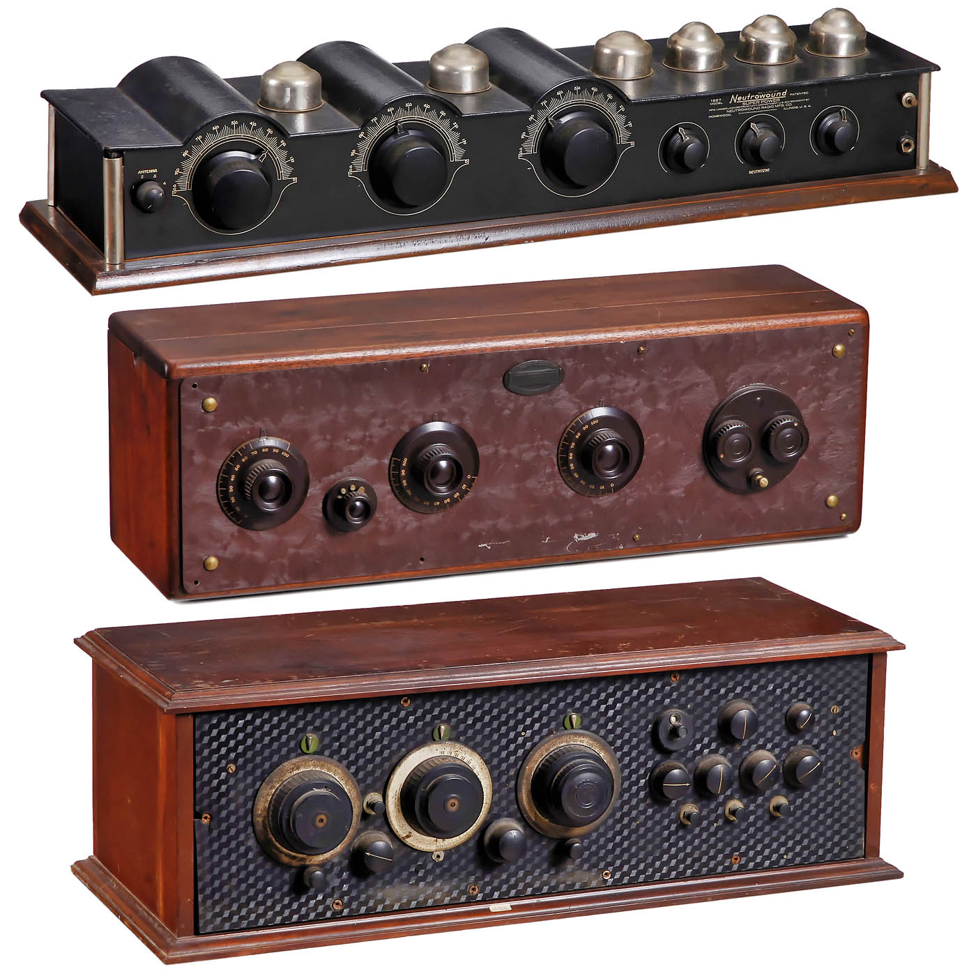 1) Neutrowound Super-Power, 1927, manufactured by Neutrowound Radio Mfg. Co., USA. 6 valves, battery, for loudspeaker, metal case, original paint, label on front, wood base, width 34 in., original mounting. – 2) Unmarked, possibly kit radio, 7 tubes (4 missing), battery-operated, for external speaker, large mahogany case, width 28 in. – And: 3) Atwater Kent, Model 20 Deluxe, c. 1924, 5 tubes, medium wave only, battery-operated, for external speaker, mahogany case.