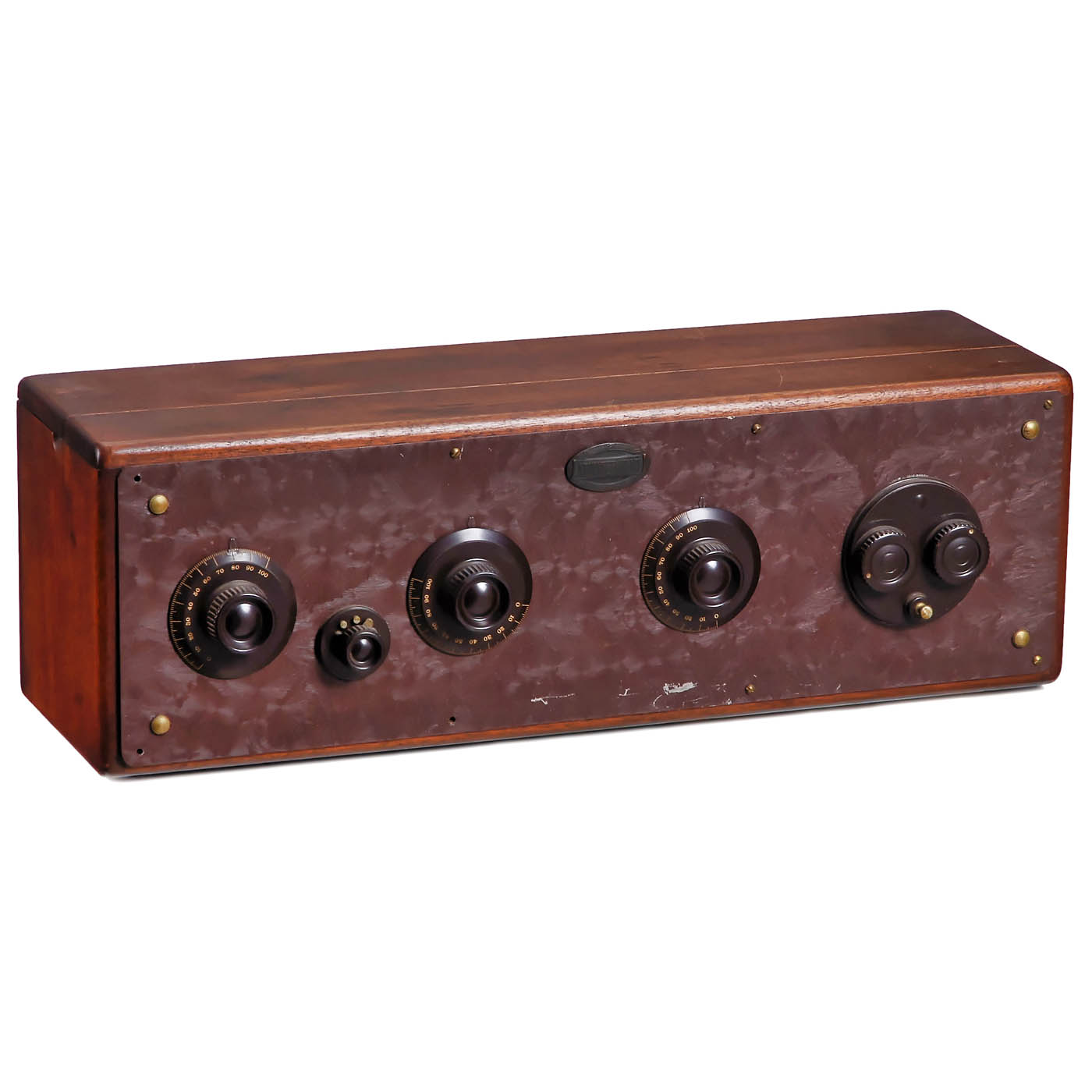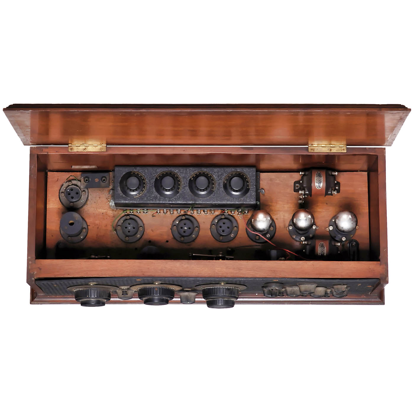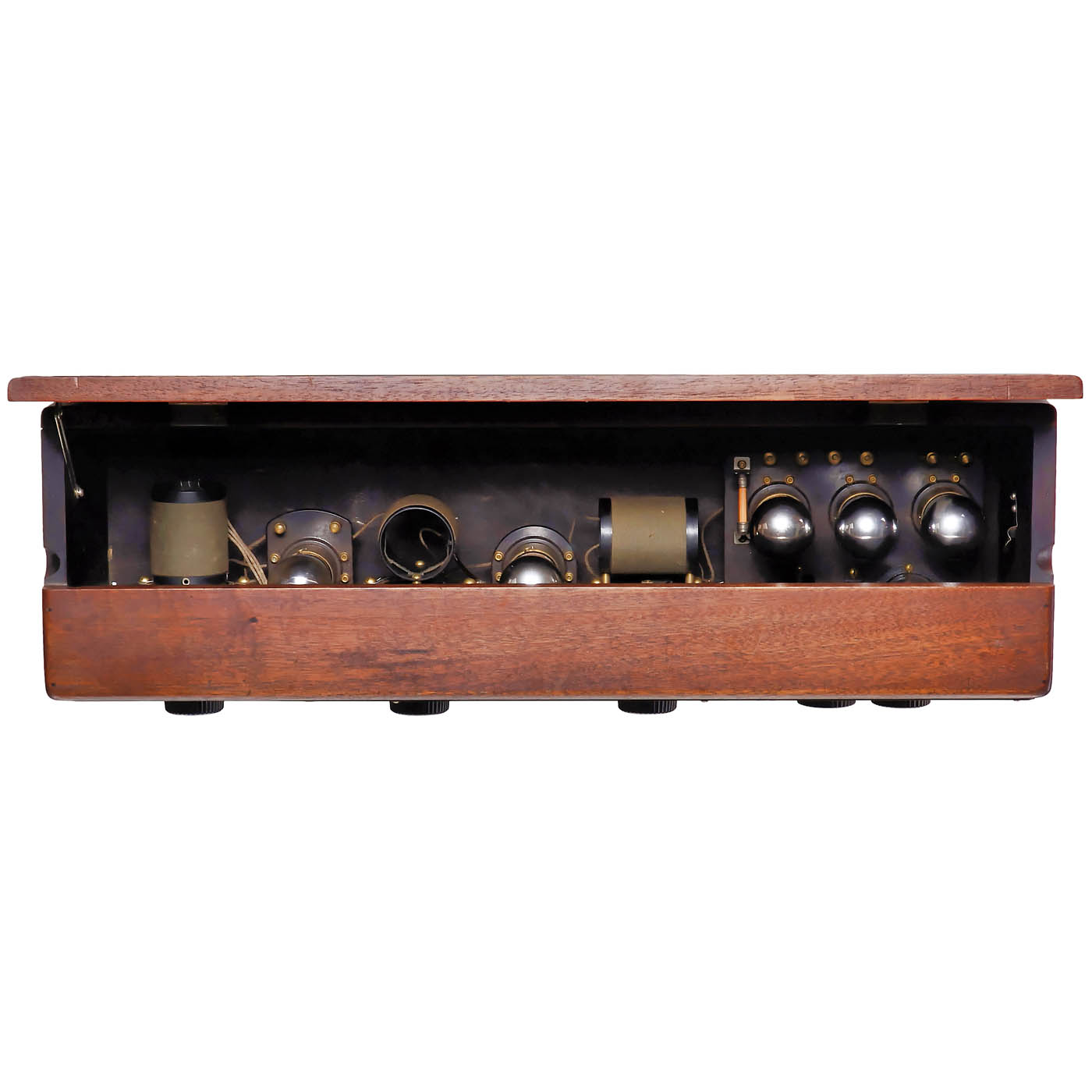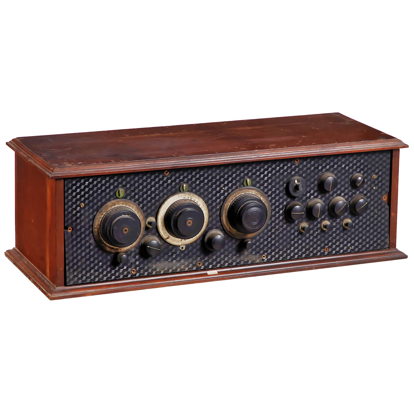 1) Neutrowound Super-Power, 1927, manufactured by Neutrowound Radio Mfg. Co., USA. 6 valves, battery, for loudspeaker, metal case, original paint, label on front, wood base, width 34 in., original mounting. – 2) Unmarked, possibly kit radio, 7 tubes (4 missing), battery-operated, for external speaker, large mahogany case, width 28 in. – And: 3) Atwater Kent, Model 20 Deluxe, c. 1924, 5 tubes, medium wave only, battery-operated, for external speaker, mahogany case.