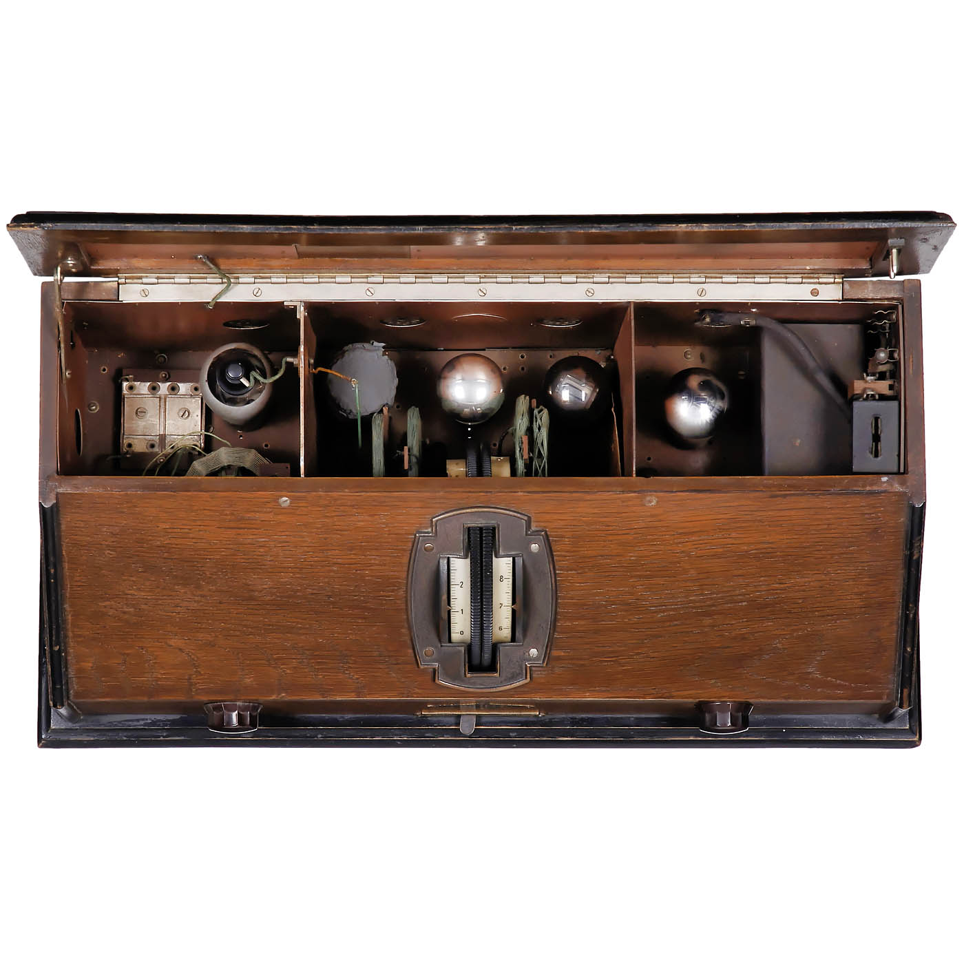 1) Seibt EW 496, 5 tubes, long wave and medium wave, 125–220 volts AC, 2 drum scales, for external speaker, oak case with lid. – And: 2) Elaborately constructed 4-tube receiver, with Weilo Champion model 10 choke coil for mains connection, 6 heating resistors, 3 variable capacitors with fine adjustment scales and further components, oak case, inside all sides covered with metal sheets. A high-quality radio receiver.