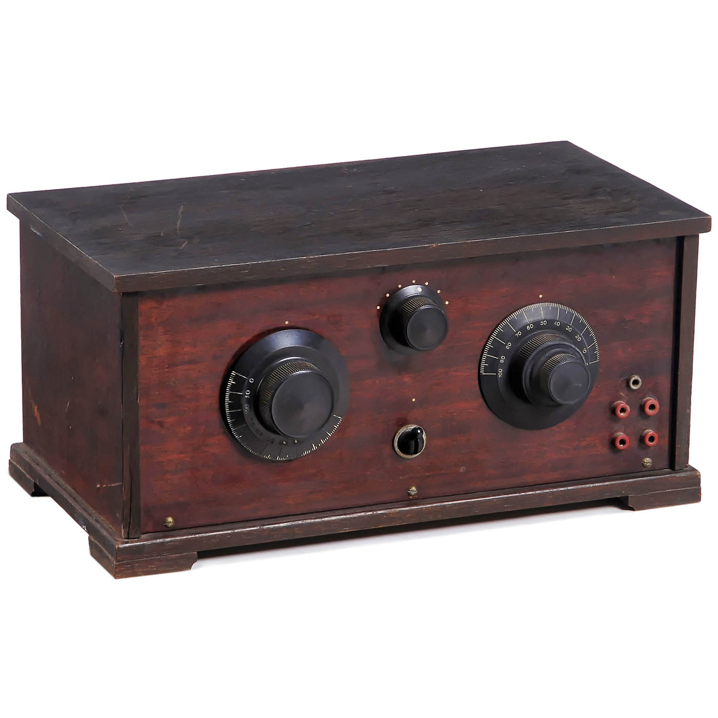 1) Huth E 93 WH, c. 1930, Signalbau Huth, Berlin, 4 tubes (missing), long wave and medium wave, for external loudspeaker, wood case. – 2) Saba 31W, c. 1931, 4 tubes, long wave and medium wave, 110–220 volts AC, for external loudspeaker, bakelite case. – 3) SB Radio, c. 1933, 3 tubes, battery-operated, for external loudspeaker, wood case. – 4) Lumophon 52W, c. 1931, Bruckner & Stark, 3 tubes, long wave and medium wave, 110–220 volts AC, for external loudspeaker, metal case. – 5) Nora W2 "Brikett", c. 1932, Berlin, 3 tubes, long wave and medium wave, 120–240 volts AC, for external loudspeaker, bakelite housing, without rear panel. – And: 6) Seibt 3a, c. 1931, Georg Seibt, Berlin, 4 tubes, long wave and medium wave, 125–240 volts AC, for external loudspeaker, wood case.