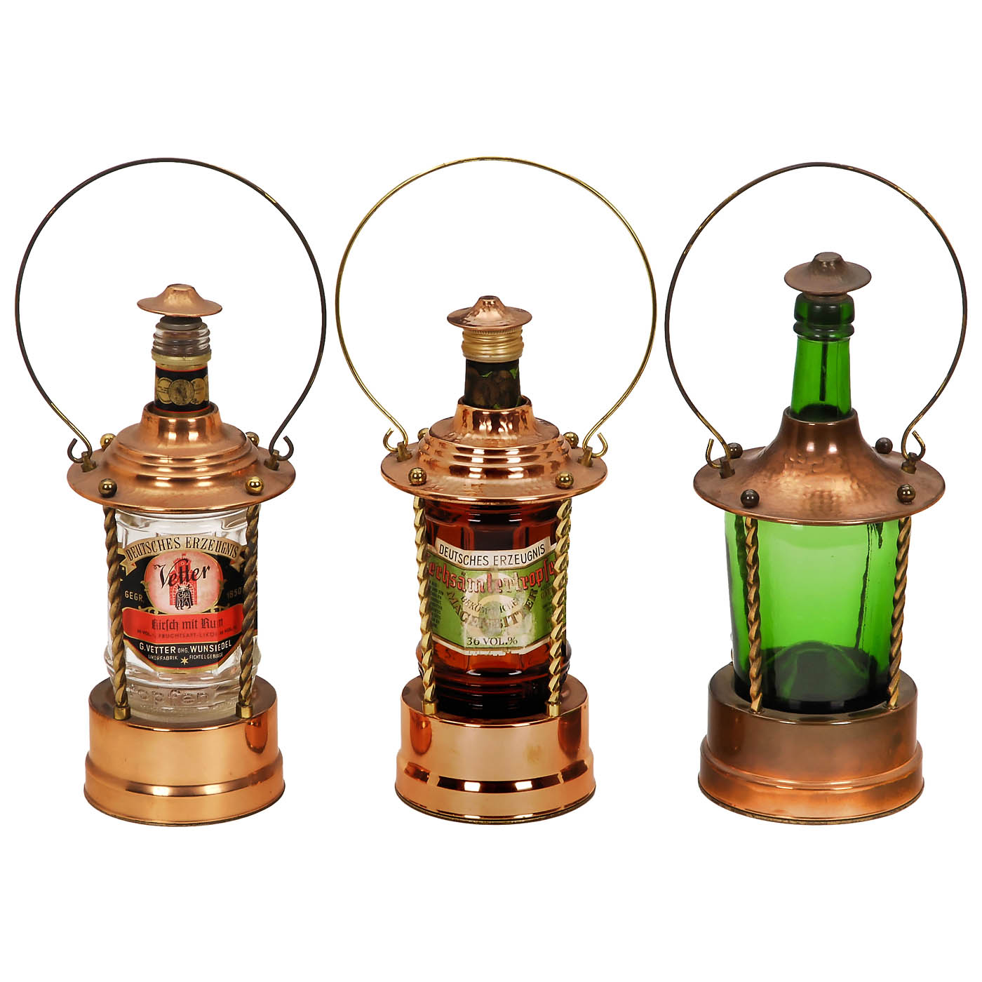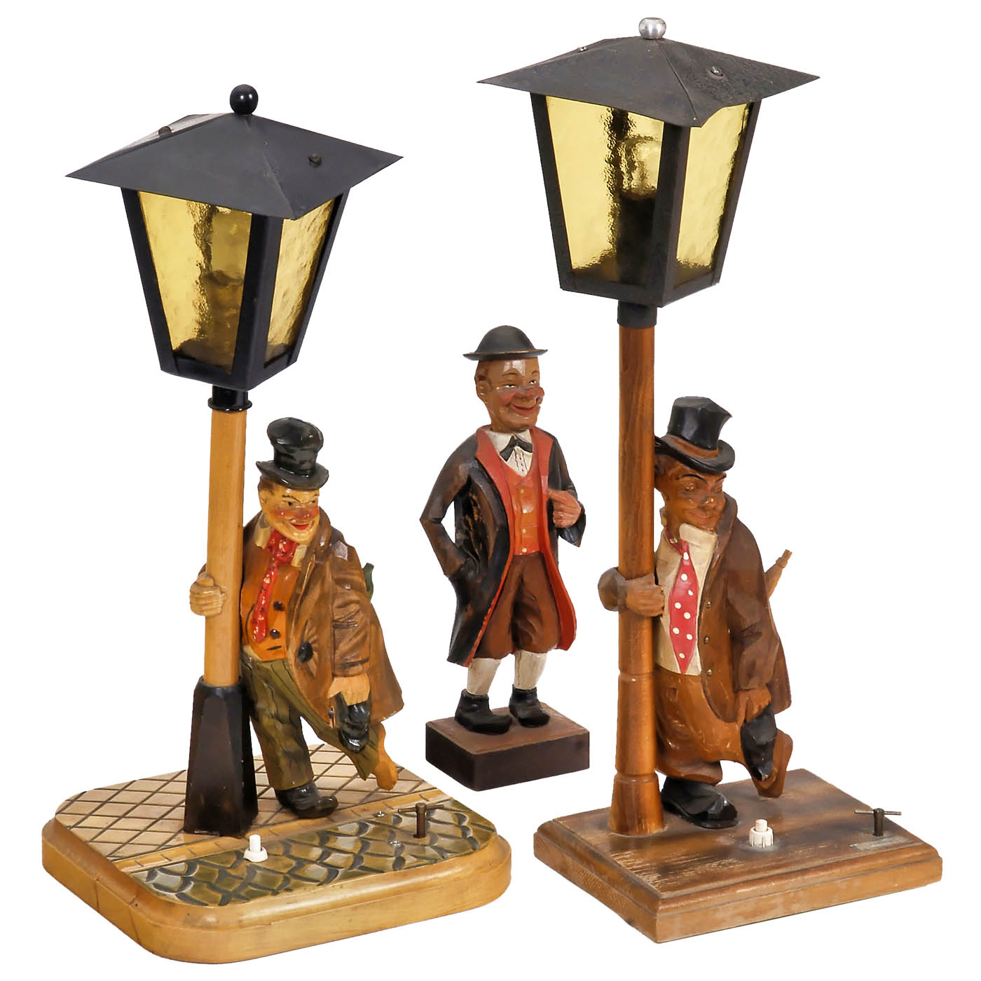 Probably Griesbaum, Triberg, Black Forest, Germany. Modeled as drunkards leaning against illuminated lamp posts (220 volts, untested), one-air movements in the bases, height 18 and 19 in. – In addition: Carved figure with small Swiss musical movement and removable head with corkscrew, and 3 brass lanterns with musical movements in the bases, released by lifting the bottles.
