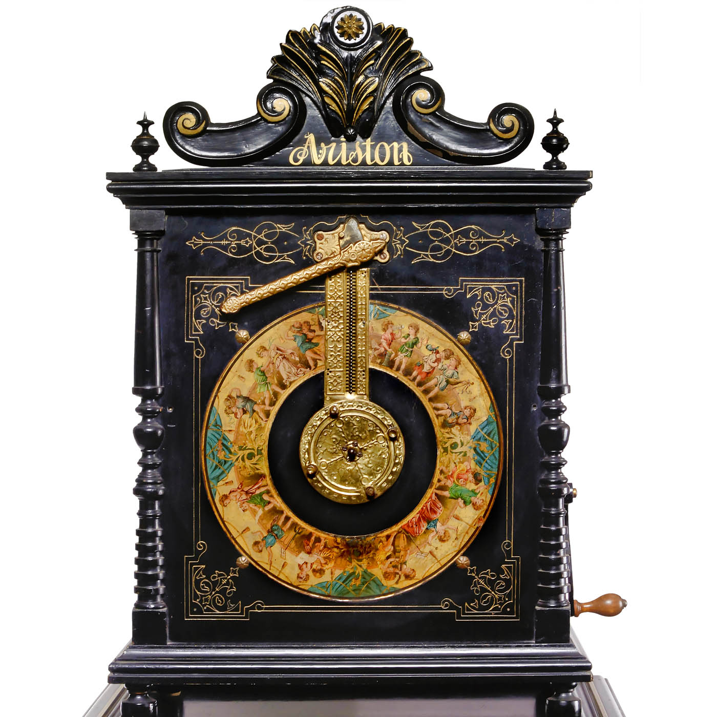 By Paul Ehrlich, Leipzig. 36 harmonium reeds, for Ø 16 3/4 in. cardboard discs, polished wood case with gilt line decoration, chromolithograph around the turntable, crank-operated, with crown and original stand, overall size 26 1/3 x 18 ½ x 58 in. Very good playing condition.