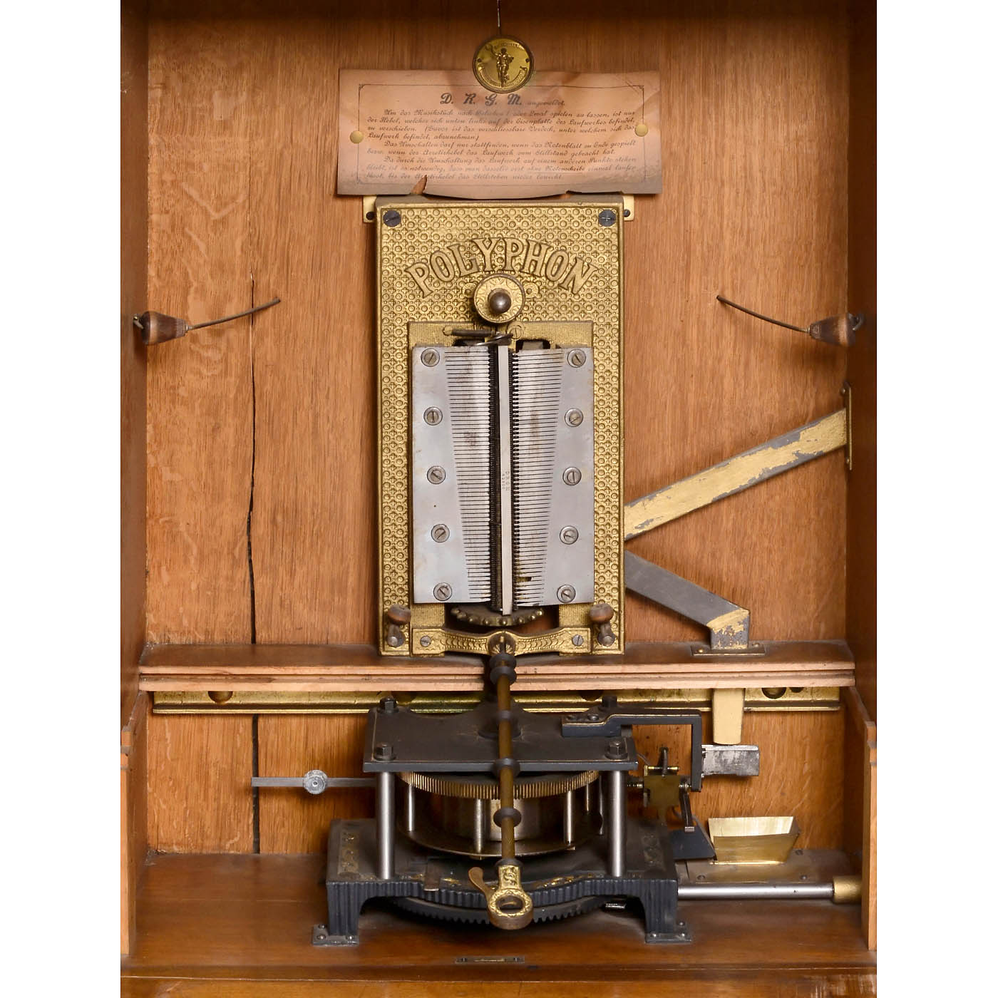 By Polyphon Musikwerke, Leipzig. For 19 5/8-inch discs, coin slot, 118 teeth in duplex comb (1 tooth broken), walnut case with base cabinet and 2 pediments, one with integrated clock, base cabinet and pediments replaced, overall height 83 in., with 46 discs, very good playing condition.