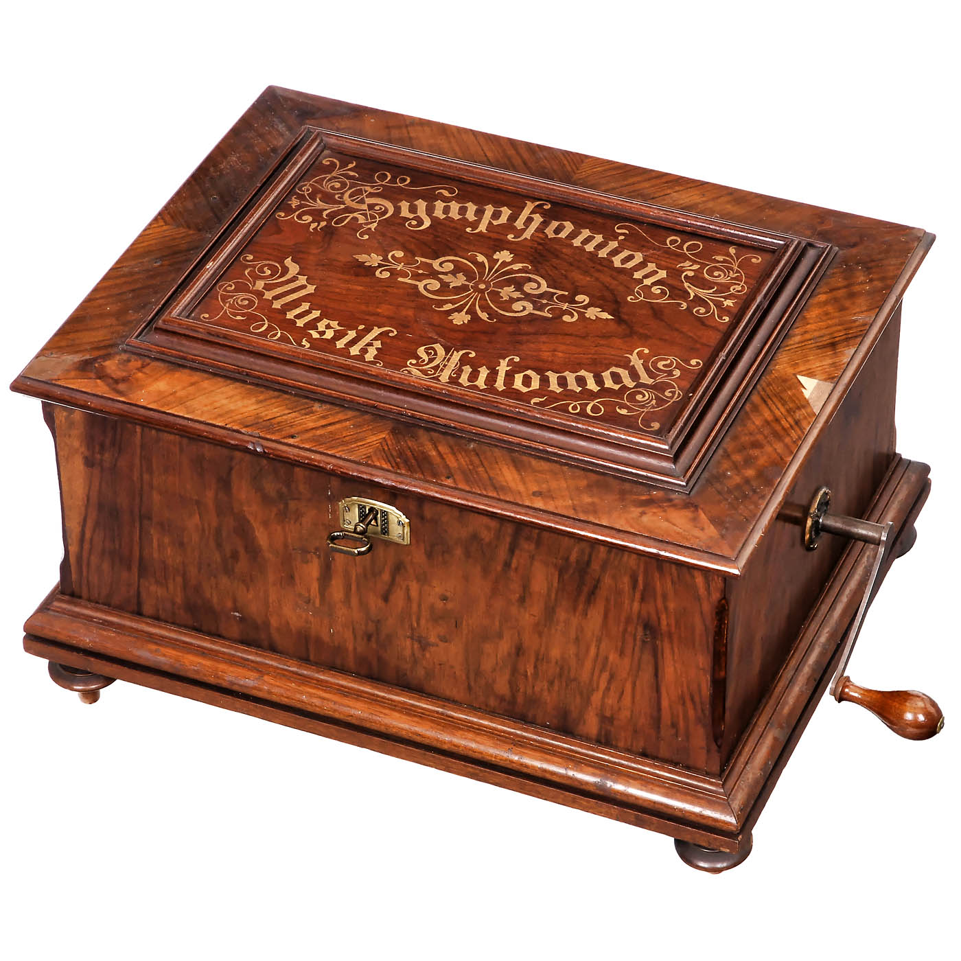 By Symphonion Musikwerke, Leipzig. For discs of Ø 10 ⅝ in., 84 teeth in 2 music combs (complete), coin-slot on left side, walnut case with "Symphonion Musik Automat" lettering on lid, inner lid with lithograph, coin drawer with lock and key, instrument is working, however a comb adjustment is necessary. With 12 discs.