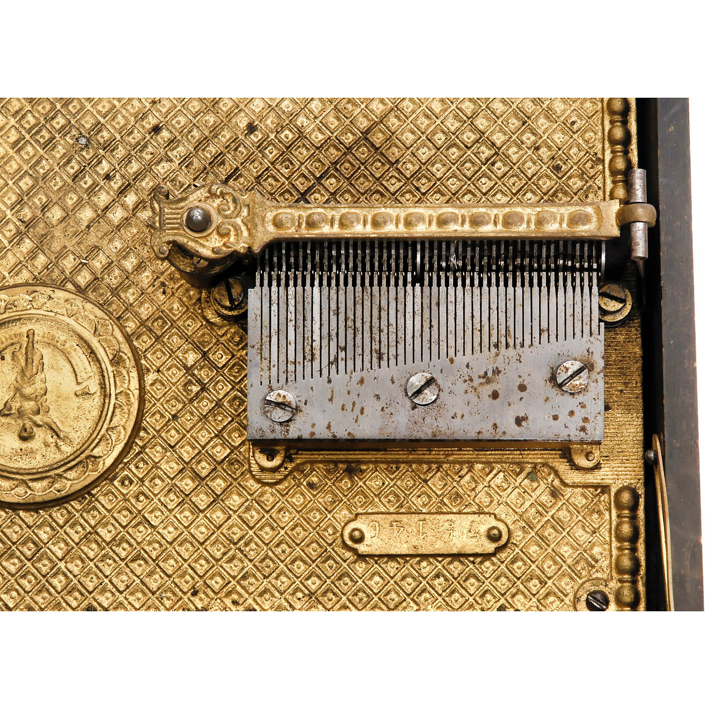 1) Polyphon, for Ø 9 ½ in. discs, 46 teeth in steel comb (complete), lever-wound, case in need of restoration, working, with 23 discs. – 2) Manivelle cylinder musical box, thick single-air cylinder "Puppchen, du bist mein Augenstern", wood case in the shape of a portable barrel organ, working. – And: 3) Polyphon Manivelle, for Ø 8 in. discs, 40 teeth in steel comb (complete), grained case with transfer on lid and lithograph in lid, good original working condition, with 2 discs.