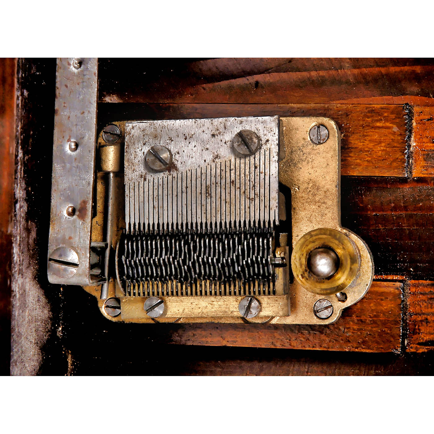 1) Symphonion Manivelle No. 28, for 5 ¾ in. discs, 40 teeth in steel comb (complete), hand-turned mechanism, working, with crank and 7 discs. – 2) Symphonion No. 28S, 40 teeth in steel comb (complete), lever-wound spring mechanism, working, case damaged at lid, with 5 discs. – 3) Table clock with musical movement, unmarked, for 4 ⅘ in. discs, 32 teeth in steel comb (complete), clock movement defective, musical movement working, wood case, height 14 ¾ in., with key and 1 disc. – And: 4) Mauthe wall clock, pendulum movement, wood case, height 21 ⅔ in., the movement works running, the hour-strike is defective.