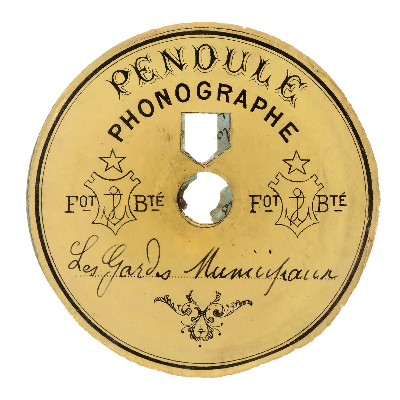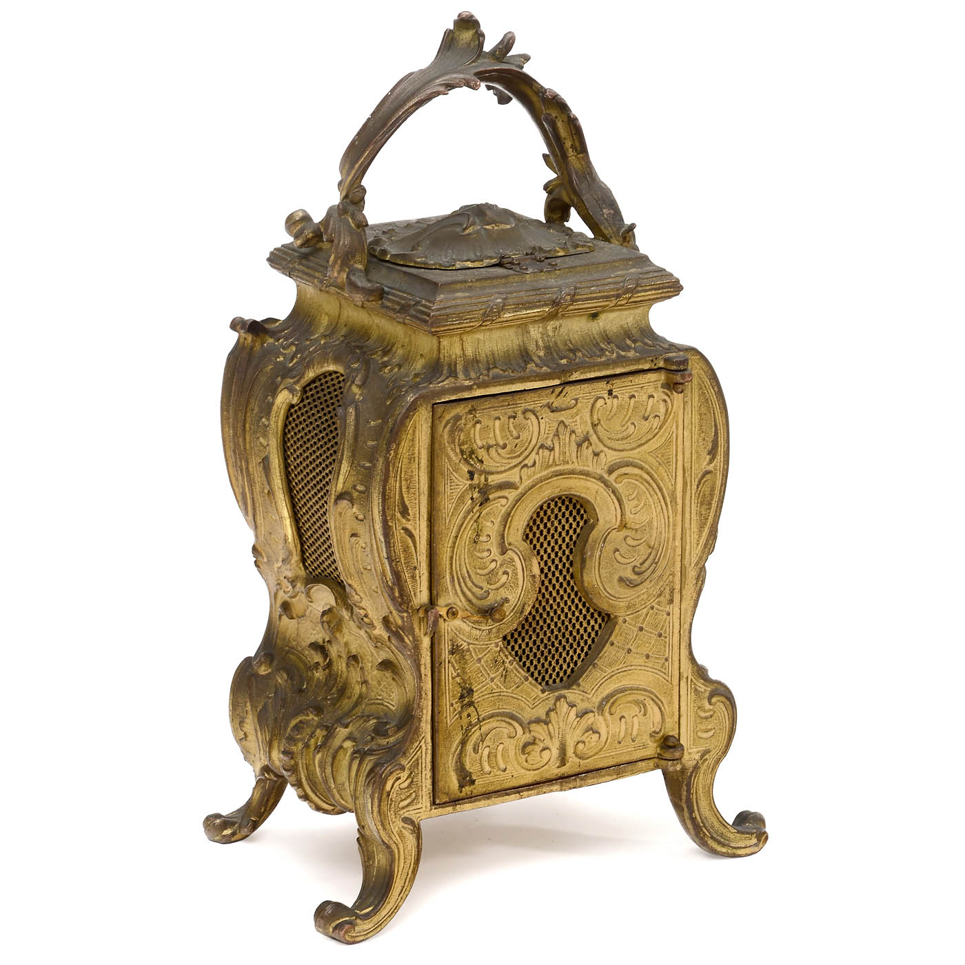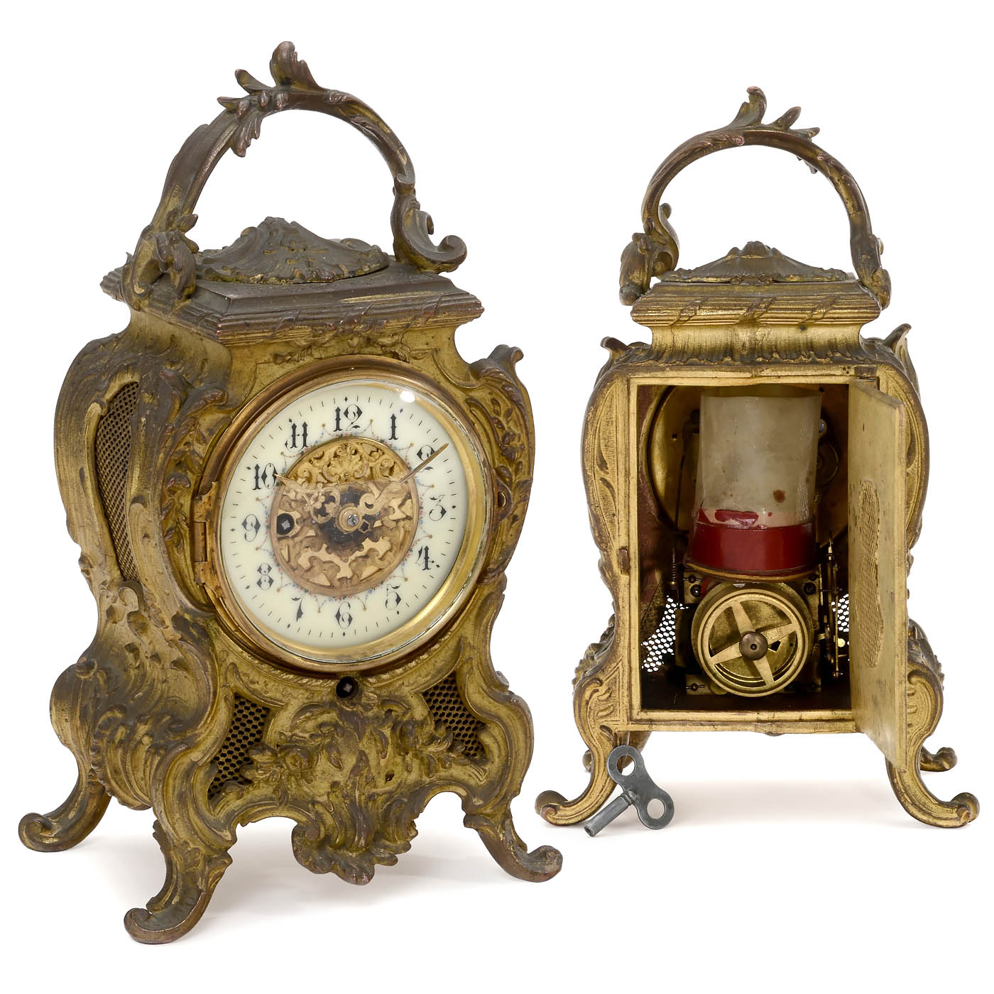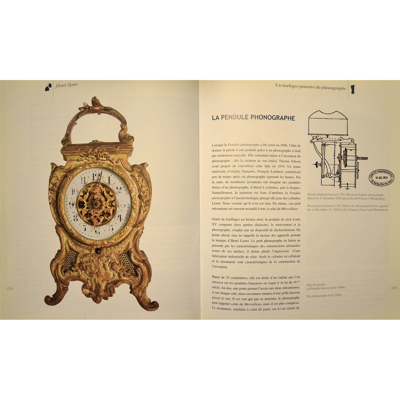 Rare French phonograph "Le Merveilleux" for celluloid cylinders with 30-second playing time, invented and built by Parisian clockmaker Henri Lioret (1848–1938), with French clock movement by Farcot et Wandenberg No. 114, cast gilt-metal case in the style of Louis XV, 4 sound frets and porcelain dial, height 13 ¾ in. – In 1896, the Société Farcot et Wandenberg asked Henri Lioret to supply parts, cylinder and soundbox for a phonograph clock. The movement and the cylinder of the phonograph clock came solely from Lioret's workshops. The special cylinder bears the trademark of Farcot et Wandenberg on its label. The model can also be found in the 1895 Lioret cataloge, No. 4206, "Les Gardes municipaux". At the selected alarm time, the phonograph mechanism is activated, the top lid of the clock opens, the cylinder plays and at the end the mechanism stops and the lid closes again. – Good condition, movement and phonograph mechanism are working. – A milestone in phonograph history and an essential exhibit for the advanced collection.