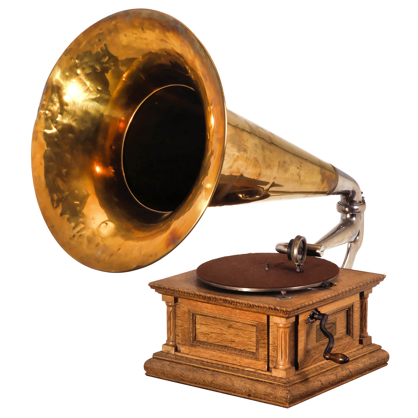 By "Deutsche Grammophon Aktien Gesellschaft". Oak cabinet with carvings and 4 columns, "Writing Angel" plaque and "Deutsche Grammophon" decal, superb brass horn, Ø 17 in., nickel-plated arm, HMV "Exhibition" reproducer, underside stamped with "DGAG 18860". – A fine machine, in very good playing condition.