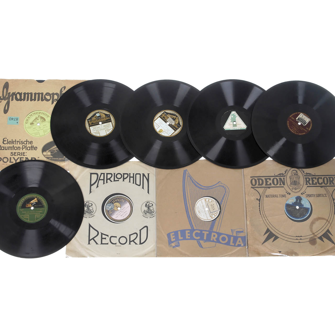 11 ¾ in. shellac records, mostly with original sleeves: 14 x Enrico Caruso (including 5 single-sided first recordings) – early single-sided recordings before 1910 (including 3 with writing angel as front logo) – 6 records with inscribed autograph of the performers (Marek Weber, Parlophon, 1 x Bernard Etté, VOX, 1 x Arnold Földesy, VOX, 1 x Erich Kleiber, VOX, 1 x Felix Weingartner, Columbia, 1 x Martin Abendroth, Homocord) – Farewell speech by Nellie Melba in Convent Garden 1926 – Piano Concerto no. 2 by Sergei Rachmaninow, played by Sergei Rachmaninow – Minuet by Ignacy Paderewski, played by Ignacy Paderewski – Deutschlandlied (German national anthem), Berliner Männerchor – and further titles.