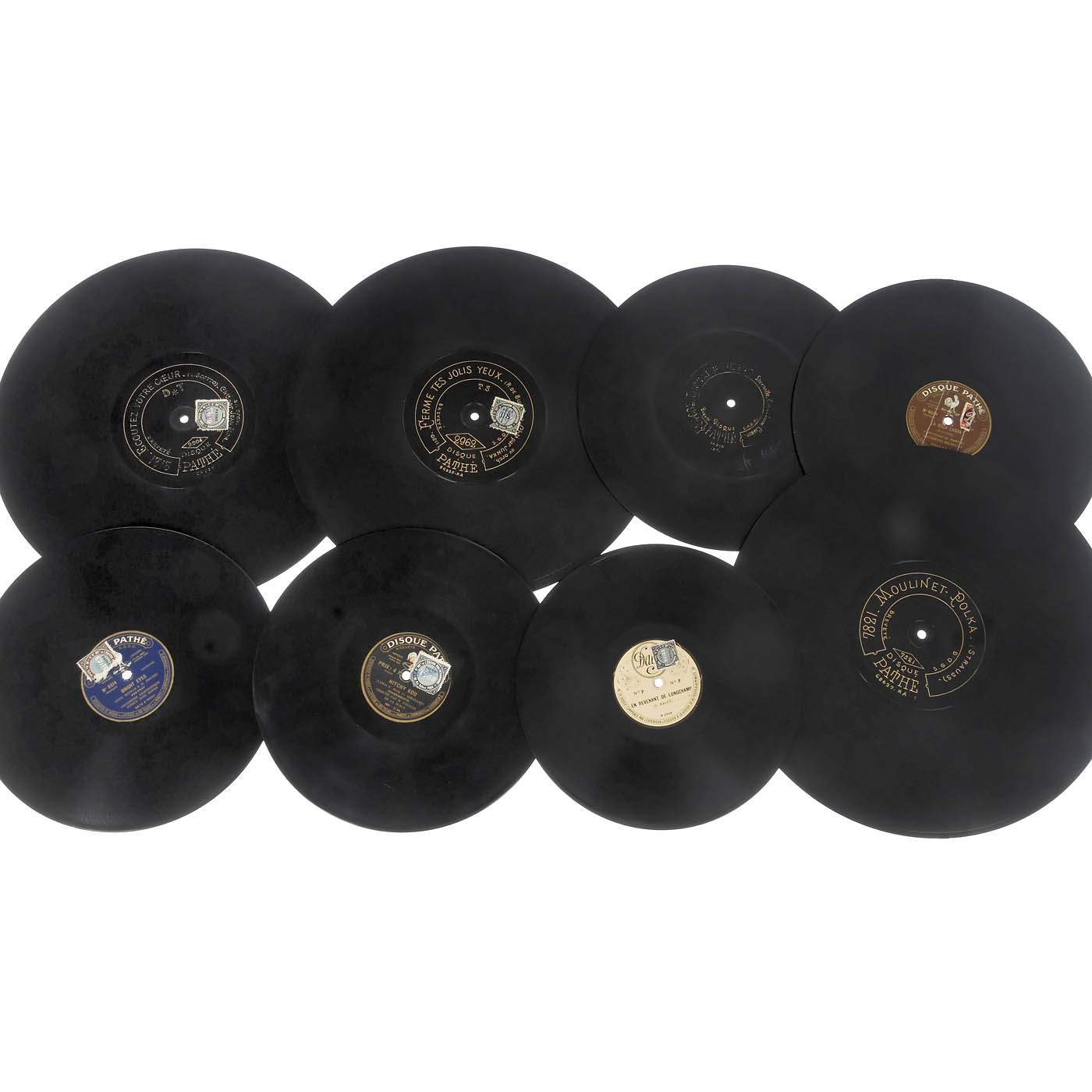 12 x 13 ¾ in. records: 1) 7521, "Moulinet-Polka" and "Nachtigal". – 2) 2904, "Ecoutez votre coeur" and "Elle avait seize ans". – 3) 2962, "Ferme tes jolis yeux" and L'Âme des violons". – 4) 7503, "Luba" and "Essuyez ces Larmes". – 5) 37, "Le Trouvere" (single-sided recording). – 6) 401, "L'Africaine" and "Mireille". – 7) 3543, "Les Cadres" and "En Frottant le Salon". – 8) 2920, "C'est Maman" and "J'ai trouvé une Fleur". – 9) 2905, "Blonde aux yeux bleus" and "Mad'moiselle voulez-vous". – 10) 2702, "Claironnant" and "Le candidat Muet". – 11) 504, "Carmen" and "Cavalleria Rusticana". – And: 12) 2748, "la Musique Amèricaine" and "C'est pour les petites Femmes". – 11 x 11 2/5 in. records: 1) 84003, "Tu non mi vuoi piu bene", sung by Enrico Caruso, very rare single-sided recording. – 2) 10 more records. – 8 x 10 1/5 in. records and 2 x 9 ½ in. records.