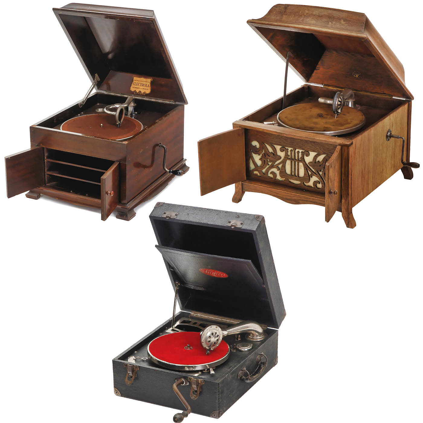 1) Fürsten, Germany. Portable gramophone, leatherette-covered wood case. – 2) Honos, probably made in Japan. Table grand gramophone, walnut case with pyramidal lid, internal horn enclosed by sound fret and doors. – And: 3) Electrola, Berlin. Salon gramophone, mahogany case, Electrola No. 4 reproducer. – All working.