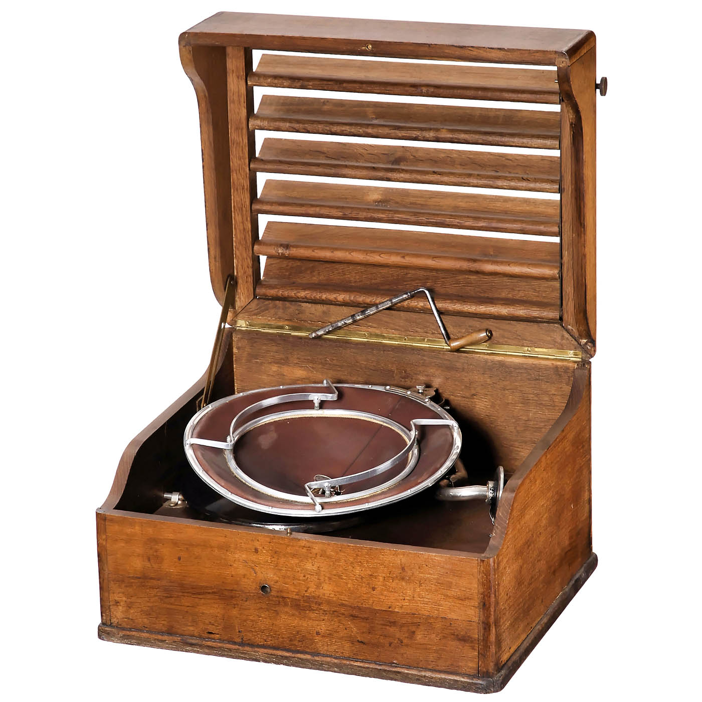 1) Pathé Diffusor gramophone, c. 1920, for vertically-cut discs, diffusor slightly damaged, missing sapphire, with additional pick-up arm for laterally-cut discs, lid with adjustable blades for the volume control, working, with 1 Pathé disc. – And: 2) "Pathéfono", France, table-top model, with 2 Pathé reproducers for vertically and laterally-cut discs, wood case, working.
