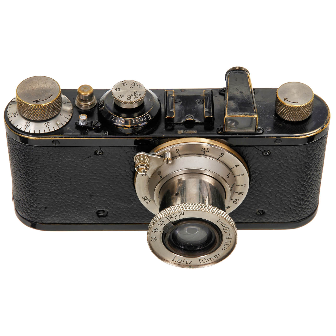 Leitz, Wetzlar. No. 978 or 9782, with brass M39 screw-mount (signs of chrome plating on the thread only) and an unnumbered Elmar 3,5/50 mm lens. It is unclear whether the camera has a three or a four-digit serial number as the "2" is of smaller width and sits too close and too high in relation to the other numbers.