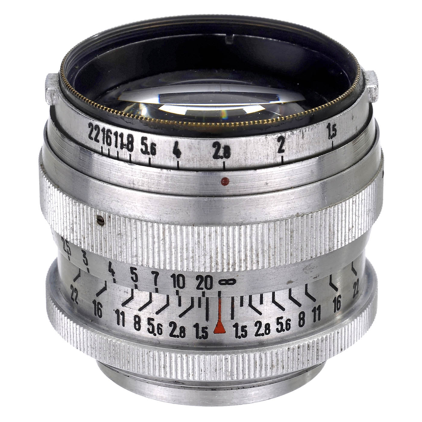 Without manufacturer's name. Without any engraving, aperture from 1,5 to 22, aperture a little bit difficult to move, filter ring with some little dents, rangemeter coupling, focusing up to 1 m. Coated lens, glass clean. From the time when the question of using a name was still unclear even for an established manufacturer.