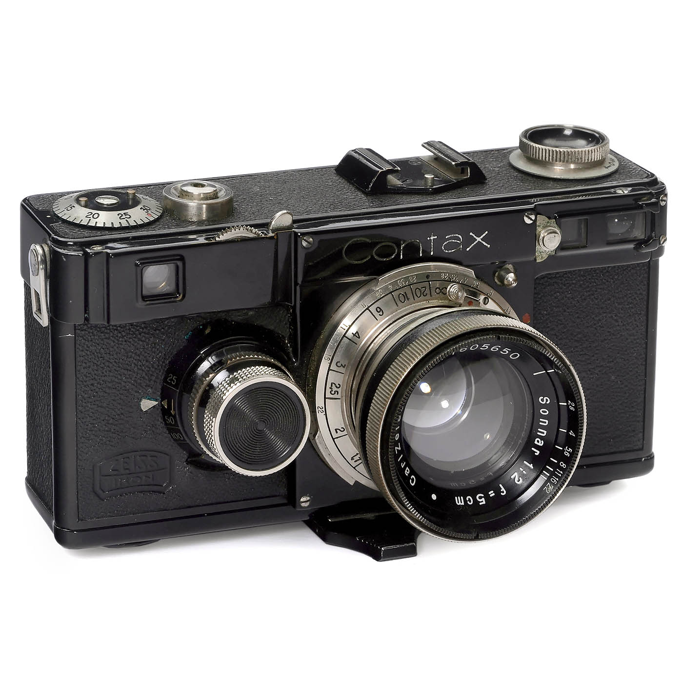Zeiss Ikon, Dresden. No. Y 96064, shutter stuck, rangefinder clean and working, with Sonnar 2/5 cm, no. 1605650, 2nd version of the Sonnar, only with point source lamp some weak scratches visible, otherwise glass clean. On camera back rewind lever missing. Paint in good condition. An attractive camera.