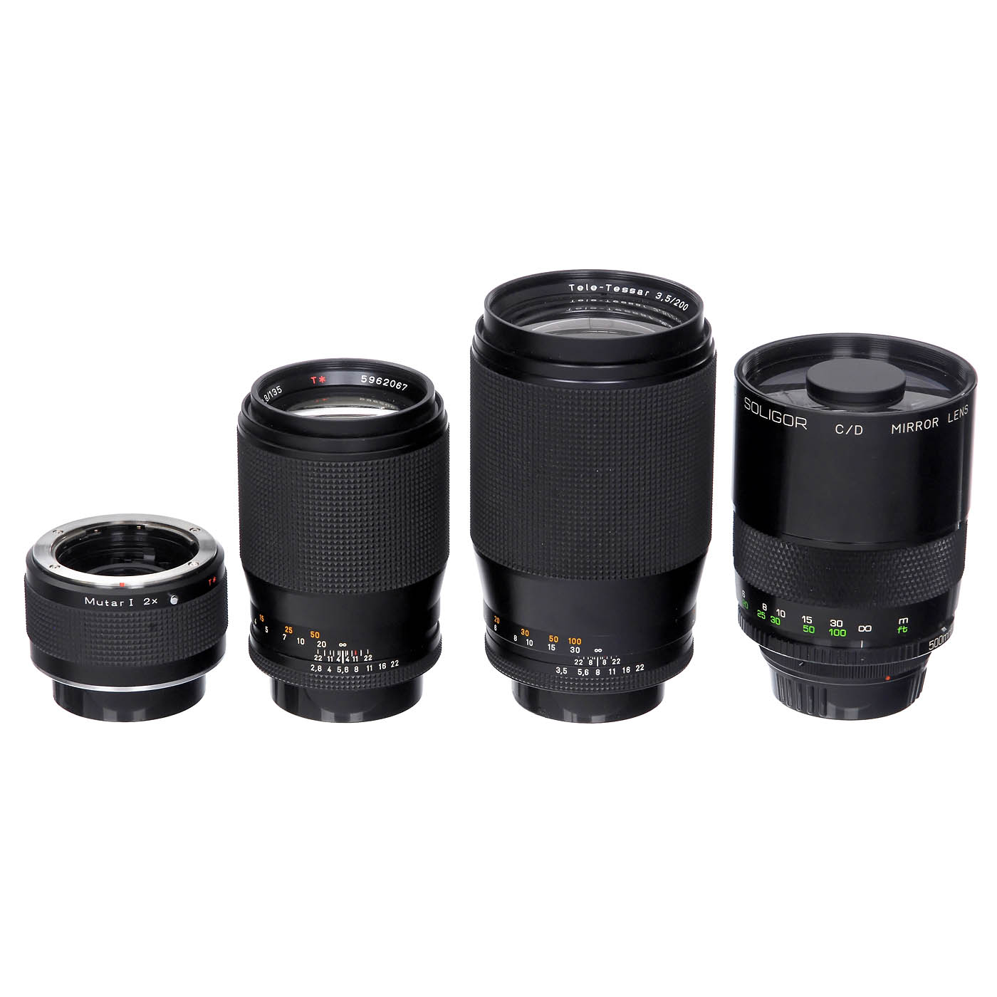 Kyocera, Japan/Zeiss, Oberkochen. 1) Carl Zeiss Tele-Tessar 3,5/200 mm. "Lens made in West Germany". (2/3) – 2) Zeiss Sonnar 2,8/135 mm. (2-/3) – 3) Zeiss Tessar 2,8/45 mm, "Pancake". Popular lens, both for users and for collectors! With guarantee card and information sheet. (2-/2-) – 4) Zeiss Mutar I, 2x teleconverter. (2-/2-) – 5) Soligor mirror lens 8/500 mm, T-2 adapter for Yashica/Contax. (3/3) – 6) Contax S2. (3/3) – And: 7) Voigtländer (Cosina, Japan). Bessa L with Super Wide-Heliar 4,5/15 mm. With viewfinder, strap, instructions and maker's box. The back of the camera needs a new cover. (3/3)
