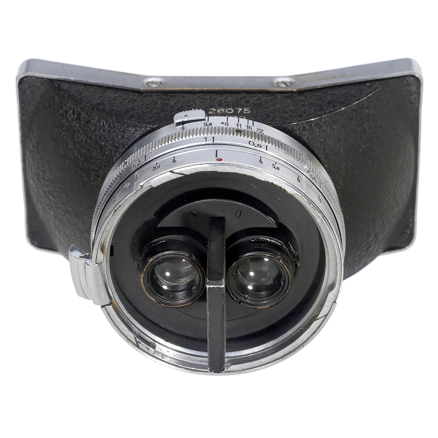 Zeiss Ikon, Dresden. Stereotar 4/3,5 cm (543/70), no. W 26075, lens with prism attachment. Glasses and prisms clean. With original back cap. – Sought-after first version produced during the war.