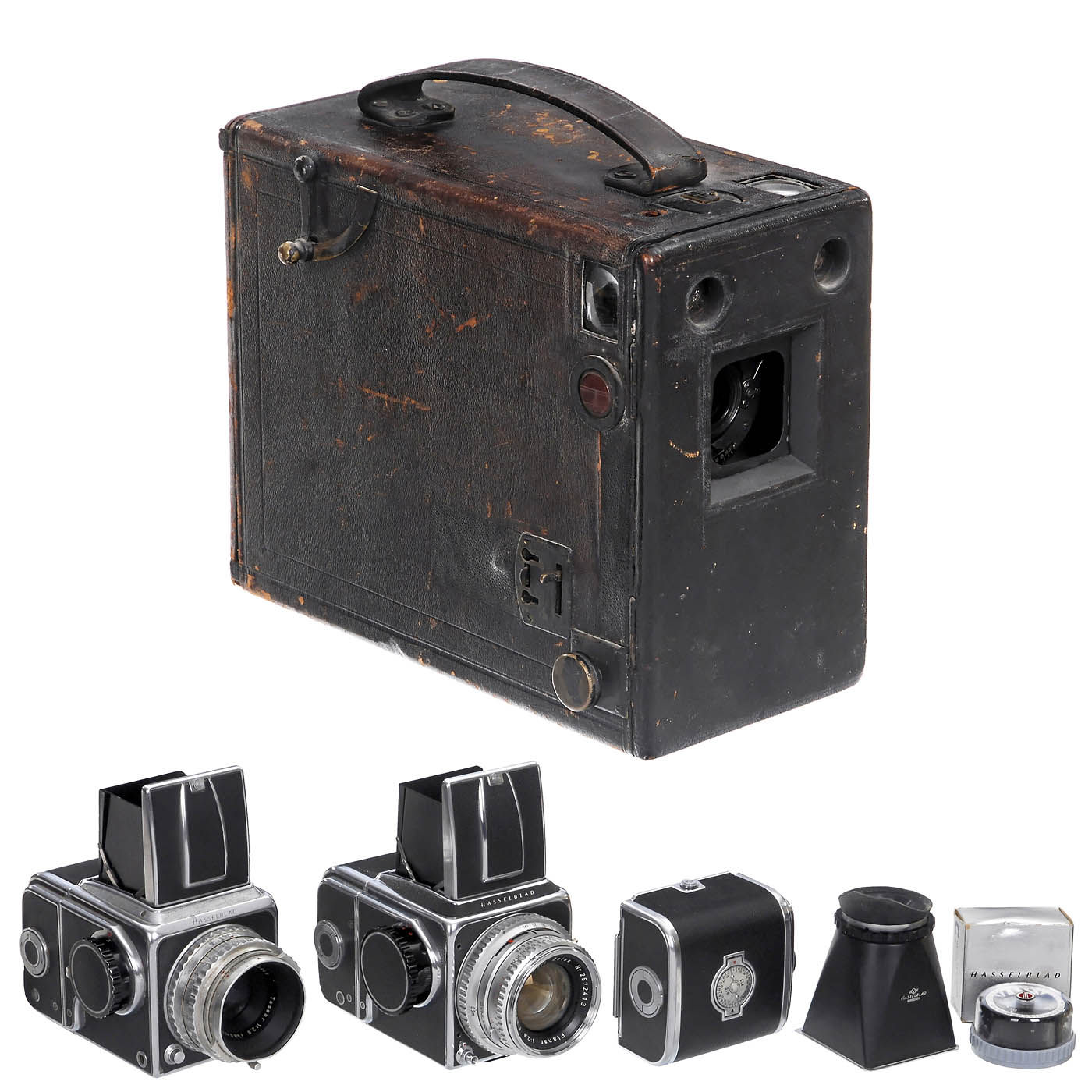1) Hasselblad, Sweden. 1600F no. CV 11514, camera was working, trying long times, shutter sticks, with Zeiss-Opton Tessar 2,8/80 mm no. 589648 and Magazin no. CV 12079. (3-/–) – 2) Hasselblad 500C, no. CU 30845, with Zeiss Planar 2,8/80 mm no. 2572413, glass clean, without function. (3/–) – 3) Two magazines CI 18062 and CU 35608. (3/3) – 4) Hasselblad leather case. (3/3) – 5) Magnifying hood, early version. (3/3) – 6) Knob Exposure Meter, works. (2/2) – And: 7) Hasselblads Svenka Express, magazine camera for 9 x 12, later added Zeiss Doppel-Amatar 6,8/13,5 cm, parts missing, on back camera name. Dainty magazine camera. (4/3-)
