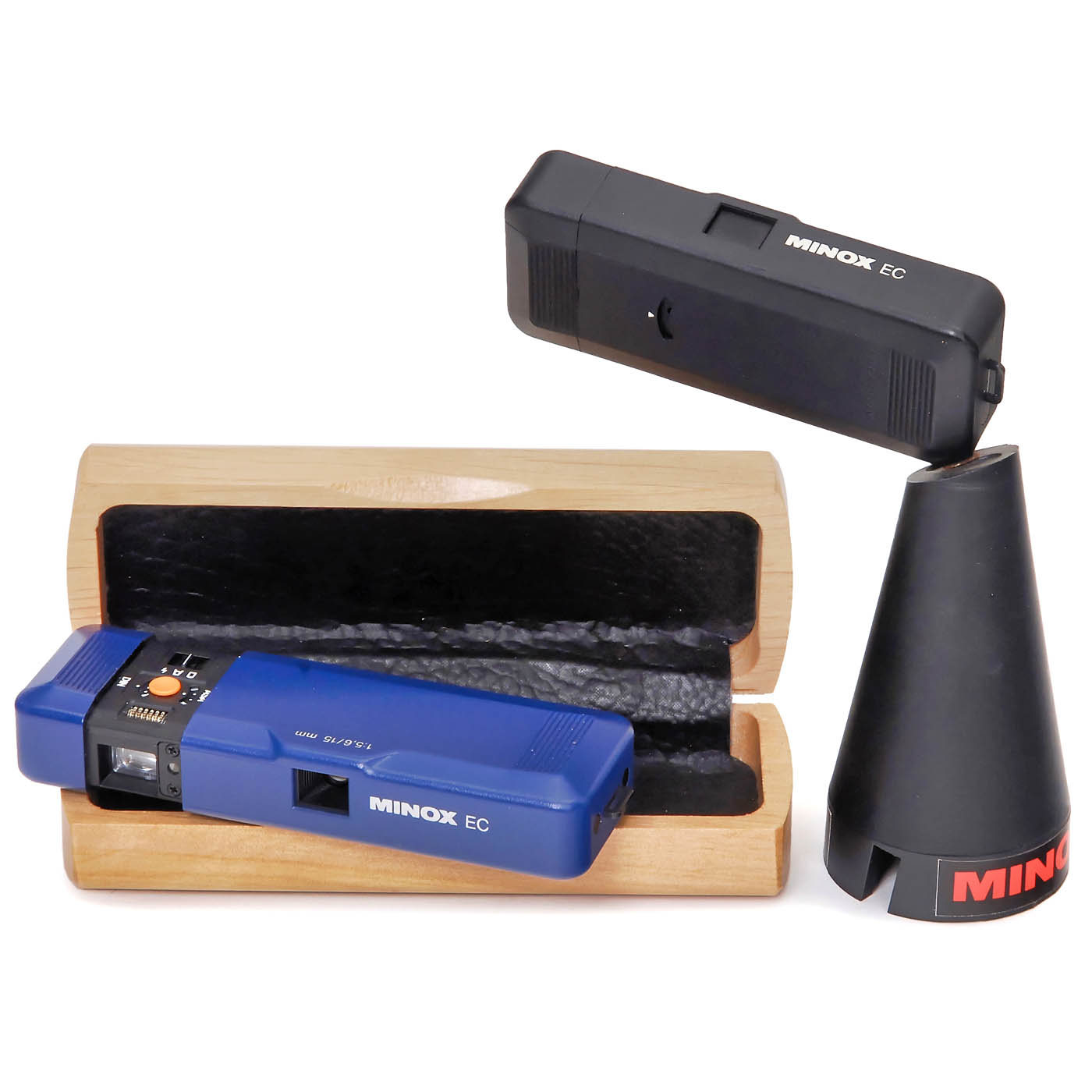 Minox, Gießen. 1) Blue Minox Club EC "W. Zapp 1905–2003", with wood case, shutter working, battery compartment stuck. (2-/–) – And: 2) Minox EC dummy on cone, ht. approx. 16 cm. Rare display piece.