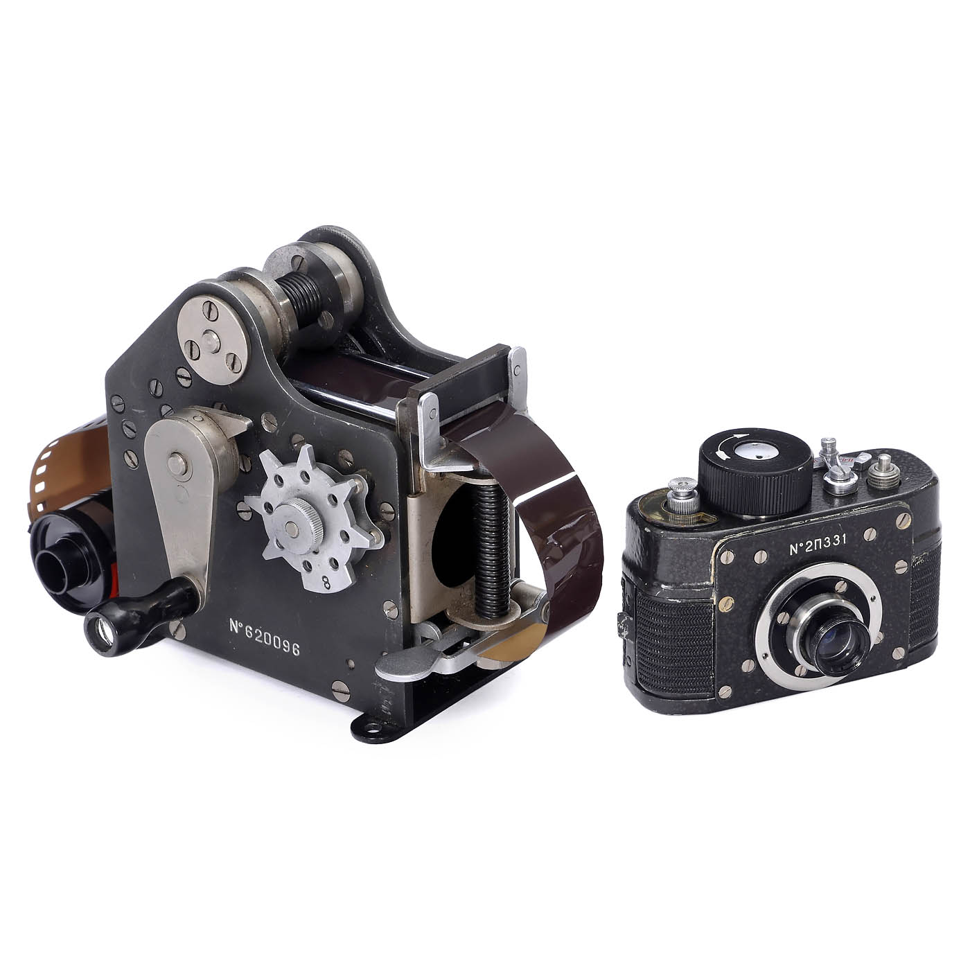 Krasnogorski Mekhanicheskii Zavod (KMZ), Ukraine, USSR. 1) Professional film cutter, no. 620096, that allowed common 35mm perforated film to be converted into 21mm unperforated film for the KGB-F21 camera. Works! (3/3) – And: 2) KGB-F21 camera, no. 2п331, with 2,8/28 mm lens, no. NT69058, motor without function, with cassette. (3/–)