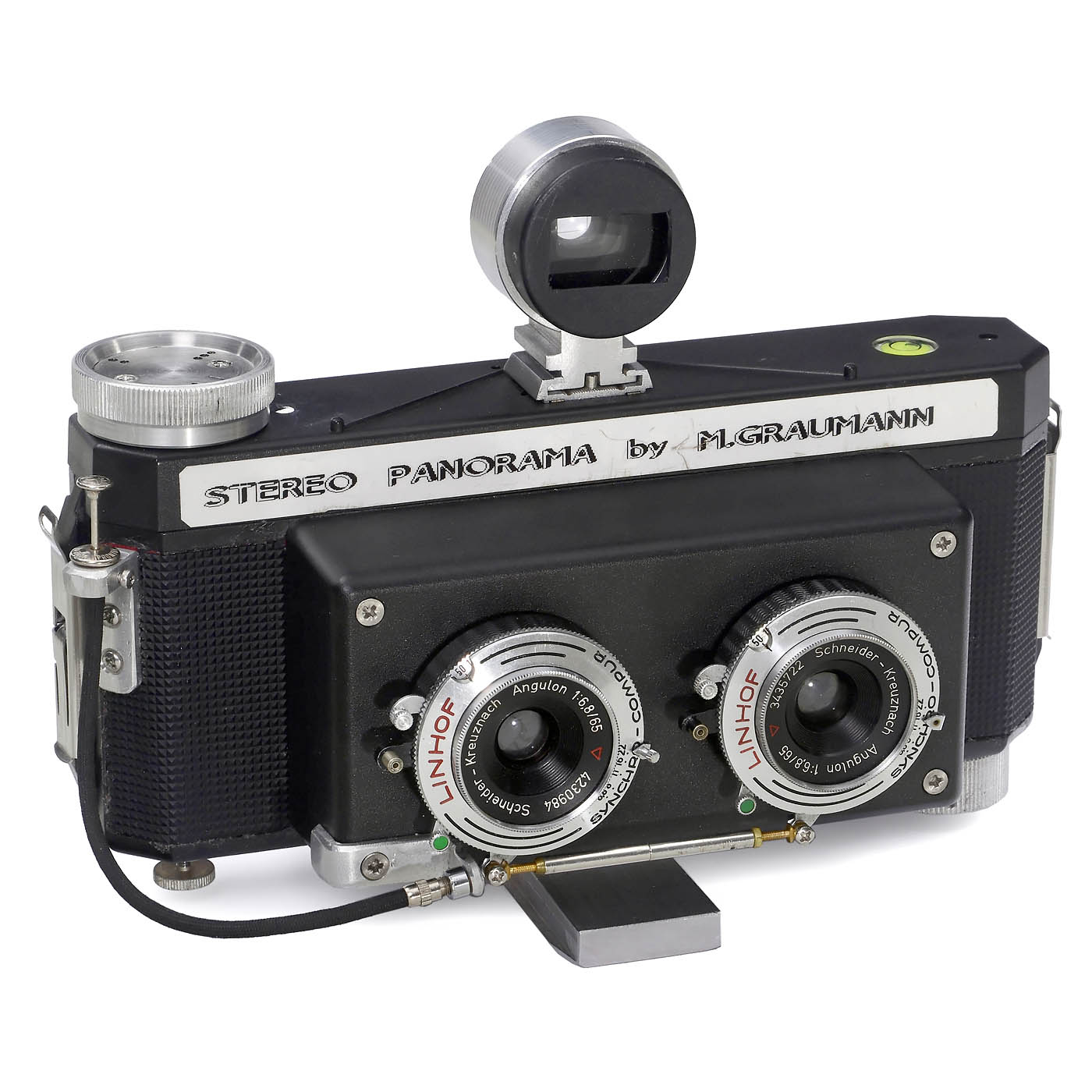 Graumann, Germany. "Lomography" body, modified for two pictures of 24 x 52 mm on 135 film, Schneider Angulon 6,8/65 mm lenses, nos. 4230984 und 3435722, synchronized release, fixed focus, viewfinder adapted for this format, spirit level, film transport. The first stereo pictures with 3 1/2 turns, than all others with 3 turns. – The lenses were measured and adjusted using a collimator. Very light-weight and solid camera of 700 g. A favorite for alpine hikers!