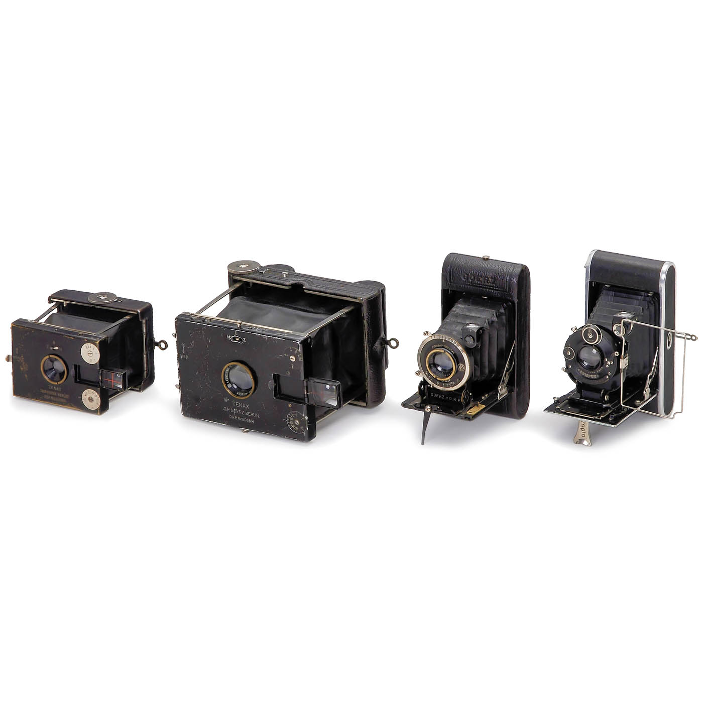 1) Kern u. Cie. Aarau, Switzerland. Simplo no. 3180, for 7,5 x 5 cm on 127 film. With Kernon 4,5/80 mm no. 2192.– Very rare camera in good condition! (3+/3+) – 2) Goerz, Berlin. Tenax no. 139811, for 4 x 6,5, Dogmar 4,5/7,5 cm. (3-/3) – 3) Tenax for 4,5 x 6 cm, Syntor 6,8/75 mm, with focusing screen back, military-style case and 6 cassettes. – This Tenax has an unusually small tripod mount, and an adapter for normal tripod mount, probably for a military device. (3–4/3+) – And: 4) Tenax for 6,5 x 9 cm, Dogmar 4,5/10 cm, with rollfilm cassette, adapted for 6 x 6 cm on 120 film. All shutter times work, Z and B sticking. (3-/3)