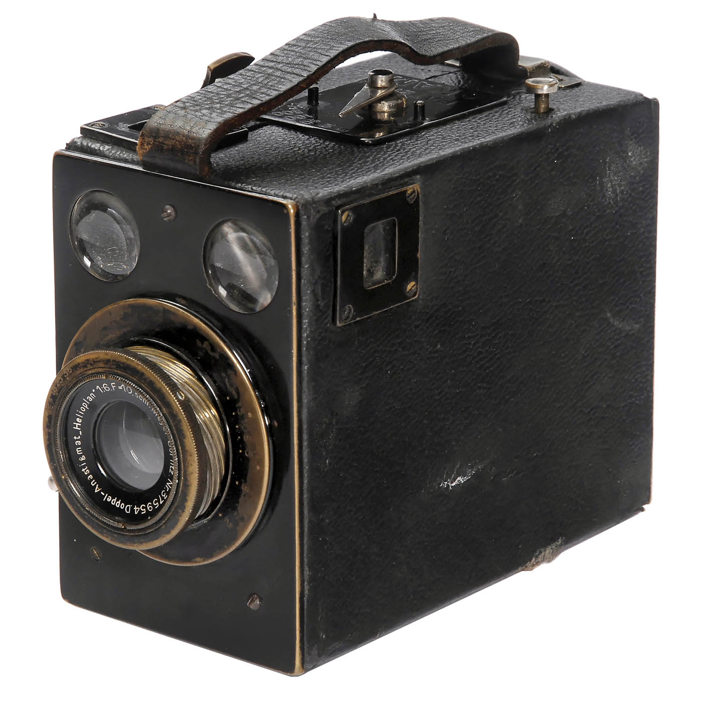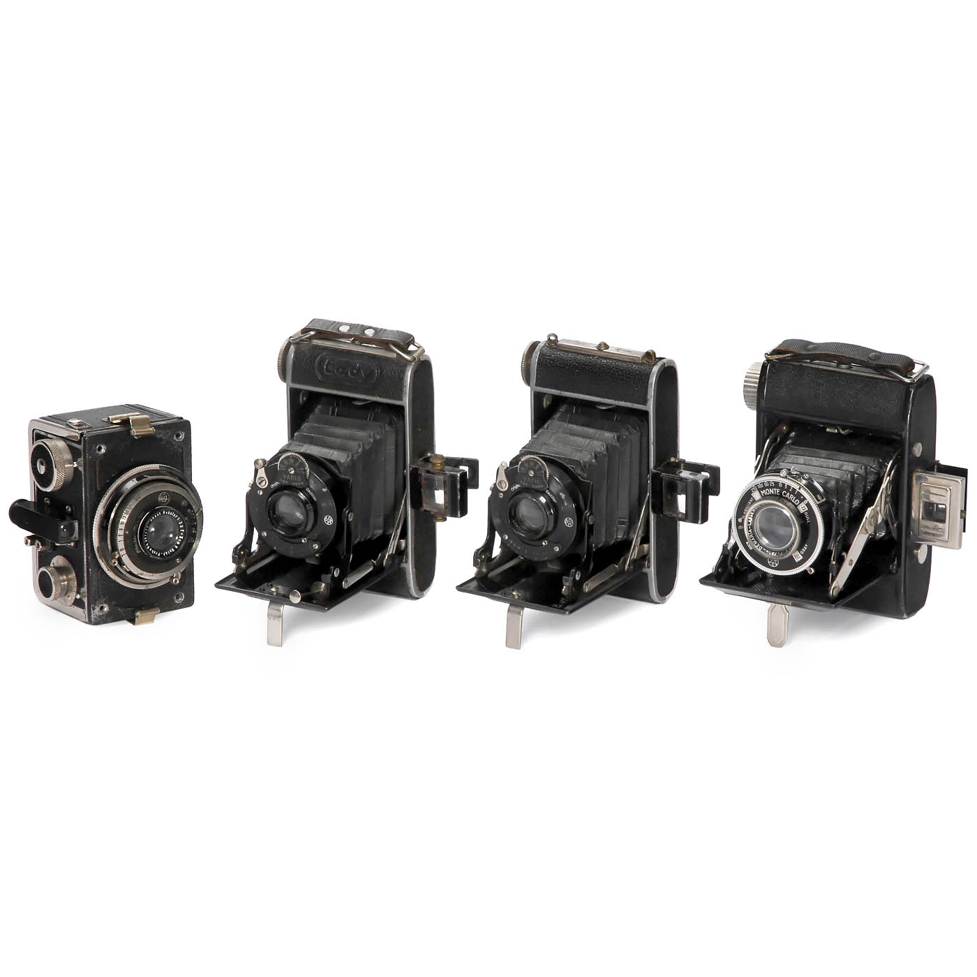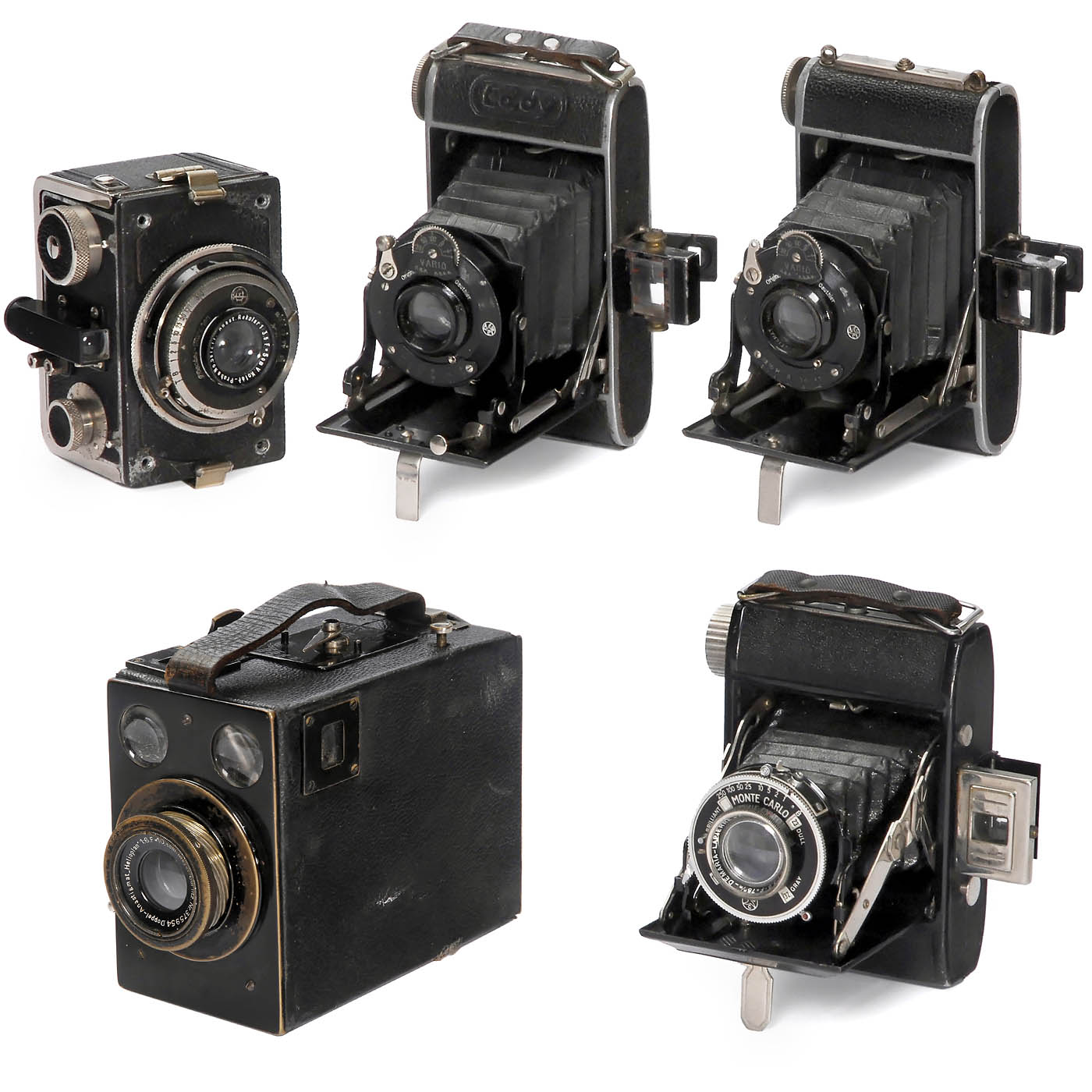 1) Keyzlar, CSSR. Patent Okam, rare camera for 4,5 x 6 cm with interchangeable lens! Meyer Helioplan 6/10,5 cm, shutter T, 1/5 to 1/500 works. With cassette in back, on one tripod mount leather with leather damaged. (3/3) – 2) Kolar, Prag. Kola, for 3 x 4 cm on 127 film, Rekolar 3,5/5 cm, Compur works, helical focusing sticking, frontplate loose. (3/–) – 3) France. Cady, for 4 x 6,5 cm on 127 film, Hermagis Major 4,5/75 mm, Vario, on back depth-of-field table in French. (3/3) – 4) Absolutely identical with 3), without embossing "Cady" in the leather, Velostigmat 4,5/75 mm, Vario, on back depth-of-field table in German. (3/3) – And: 5) France. Monte Carlo export version for England/USA, 4,5 x 6 cm on 120 film, Demaria-Lapierre Manar 3,5/75 mm, Pronto B, 1–1/250 works, Shutter speed ring similar to a light-value scale. (3/3)