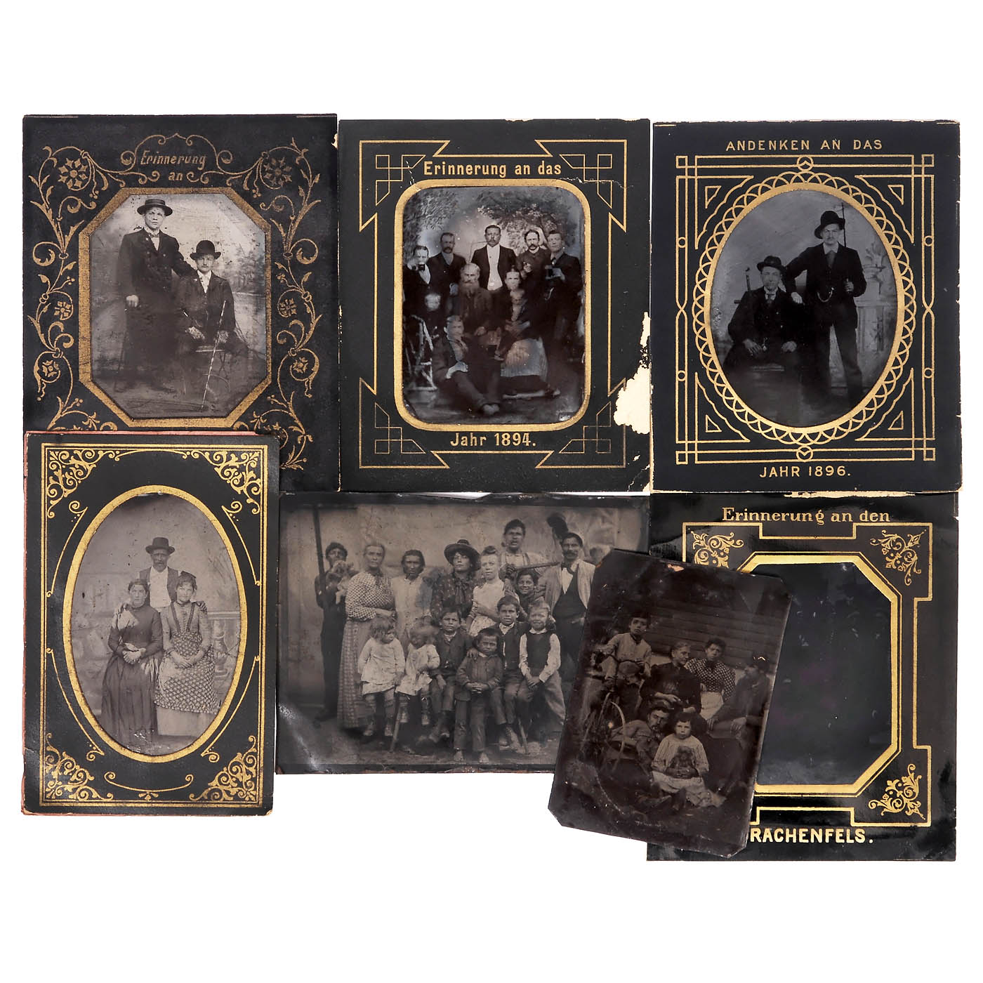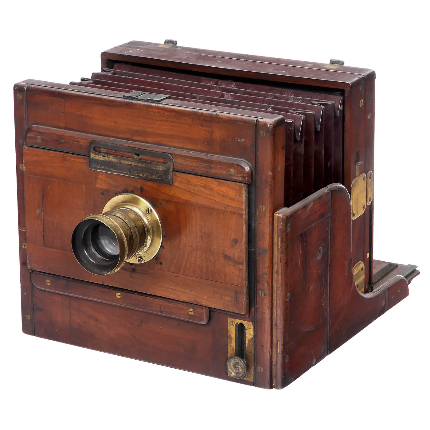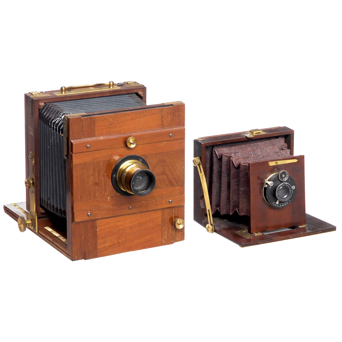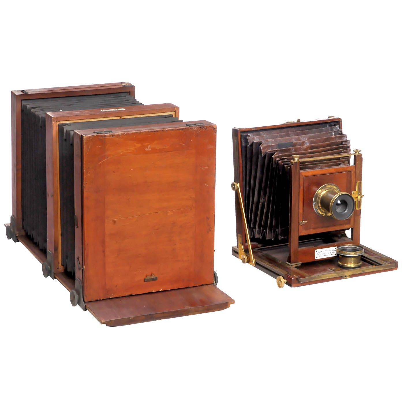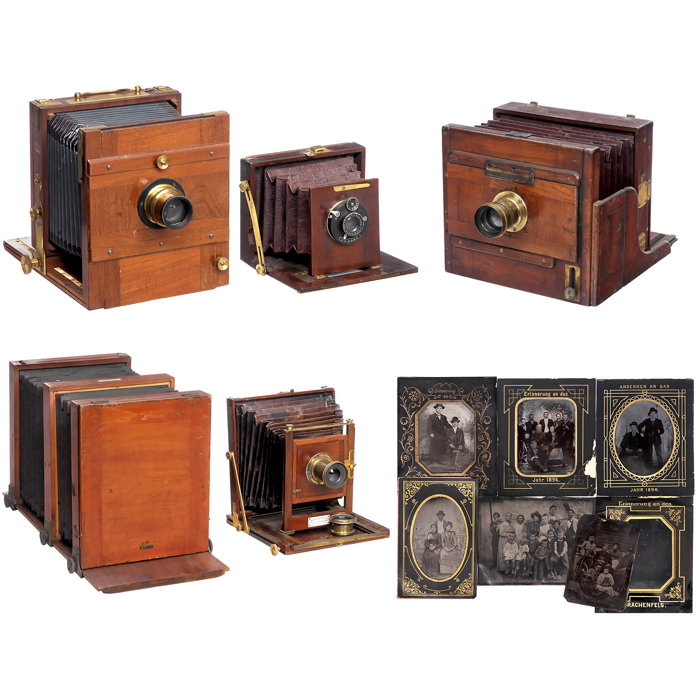 All cameras with focusing screen back. 1) London Stereoscopic Co., England. View camera, whole plate 8 ½ x 6 ½ in., tropical wood, double extension, with Dallmeyer No. 1a Rectilinear no. 13156, wide angle approx. 16/16 cm, revolving stop, for same ring: Dallmeyer 8 ½ x 6 ½ Rapid Rectilinear no. 17857, approx. 5,3/16 cm with 6 waterhouse stops in case and 6 double cassettes, numbered 1–12. With 2 suitcases for the equipment, inside maker's name, and a tripod. A complete outfit! (3/3) – 2) Probably Brückner, Rabenau. Field camera "Solid", tropical wood, 10 x 15 cm, darkgreen bellows, with Grass & Wolff, Berlin, Mars Anastigmat 8/210 mm and 6 double cassettes, numbered 1–12. Rare camera size. (3/3) – 3) Probably England. Very early strut camera for 102 x 128 mm, dark tropical wood, minimalistic fine construction, back of different wood, and 2 double cassettes, later added with red bellows and a lens. (3–4/3-) – 4) England. Early tailboard camera, 8 ½ x 6 ½ in., tropical wood, with brass lens and 3 nearly suitable double cassettes. Camera in need of restoration. (4/4-) – 5) Seven ferrotypes, from 117 x 88 mm to 90 x 62 mm, one showing a joking family with 14 persons and another a group with an early bicycle. – And: 6) Lancaster, Birmingham. Enlarger camera, for negatives of 8 x 10 in. and 8 ½ x 6 ½ in., with Oldfield, Dublin, Aplanat 8/21 cm brass lens, in front large cameraclap 11 x 13 in. as shutter and one cassette 8 x 10 in., ground glass one corner broken. Rare camera form. (4+/4+)