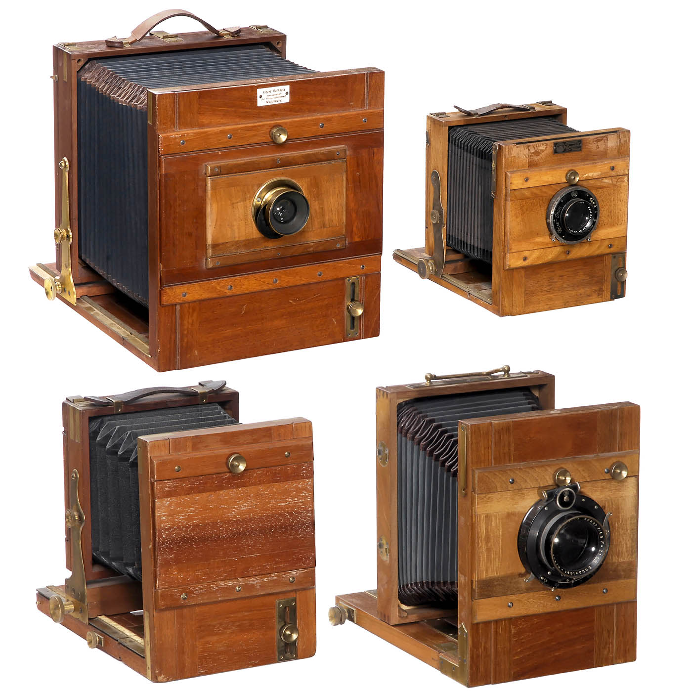 All Germany. 1) View camera 18 x 24 cm no. 33998, dark-green bellows with brown corners, tropical wood, with R.O.J.A. Busch wide-angle Aplanat No. 3 Ser. C 15/19 cm with pinhole stop, 3 double cassettes and dealer's sign "Rathke Magdeburg". (3/3) – 2) View camera 13 x 18 cm, tropical wood, dark-green bellows with brown corners, Schneider Xenar 4,5/21 cm, shutter works, glass clean, cable release plug missing, with 2 double cassettes. (3/3) – 3) Probably Sperling, Berlin. Decorative little view camera for 9 x 12 cm, tropical wood, double extension, with unused lens plate. (3-/3) – And: 4) Ihagee Kamerawerk Steenbergen & Co, Dresden. "Corona" view camera for postcard size 9,3 x 14 cm, pale wood, with Zeiss Tessar 4,5/15 cm, Compur works. (4/3-)