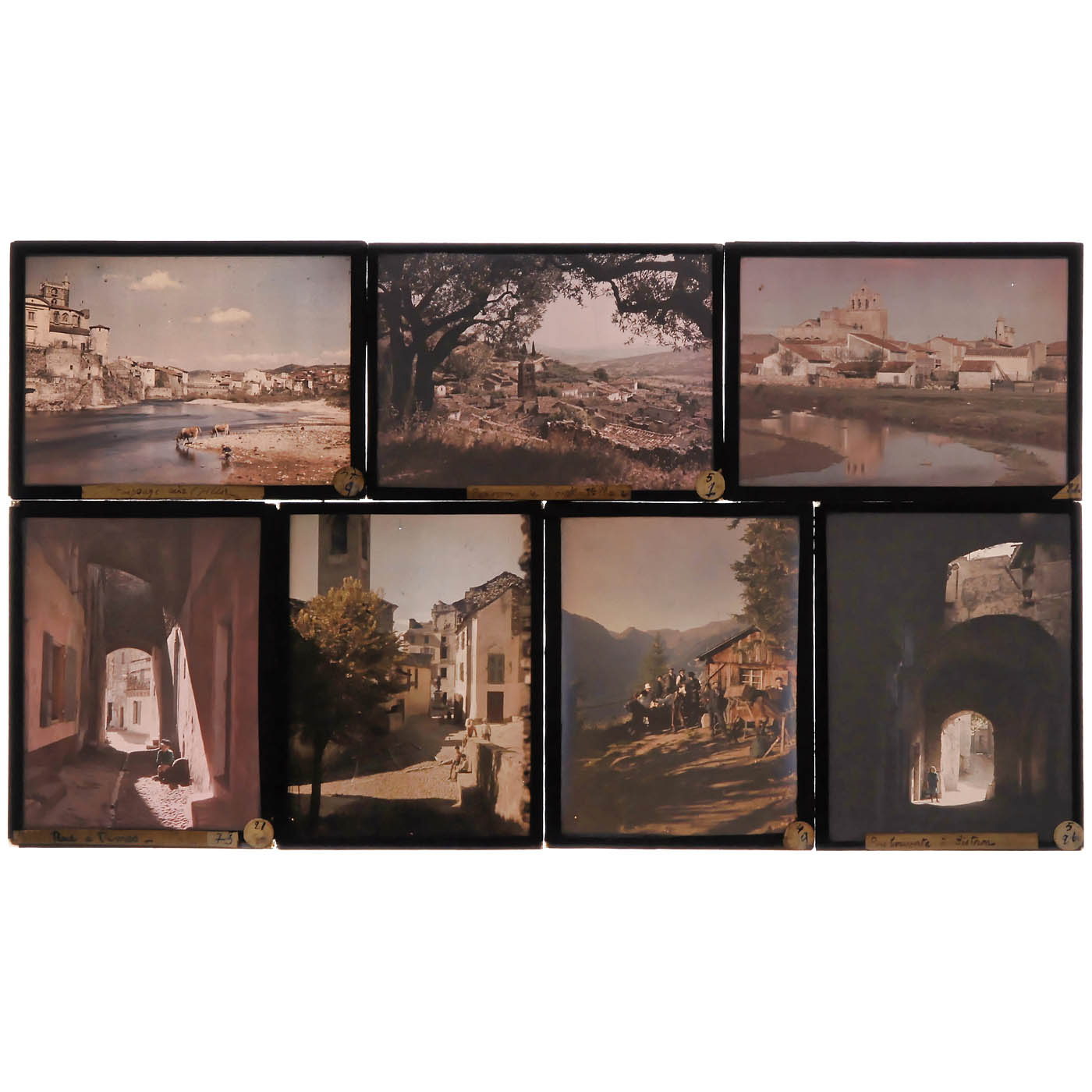 France. 56 Autochromes, in good pictures, in format 9 x 12 cm, most of them well exposed and developed, with 12 Autochromes with friends and family. All other pictures showing the rural France with its landscapes and pittoresque houses, some reminding of Atget, but in color. – All pictures are from the same person, some with notices.