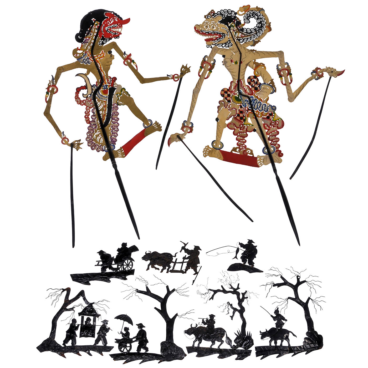 1) 3 tin figures with Chinese motifs, from 18 x 10 cm to 22 x 13 cm: angler, ploughman and rickshaw. – 2) 4 Chinese tin figures with artfully styled trees, from 20 x 26 cm to 26 x 23 cm: flute-player on ox, sedan transport, woman on handcart and children playing on oxen. – And: 3) 2 Javanese shadow puppets, probably of sculpted papier-mâché and finely carved wood with gilt decoration, depicting the white-faced ape-king Hanoman and his ruddy counteract Sugriwa, approx. 45 cm high.