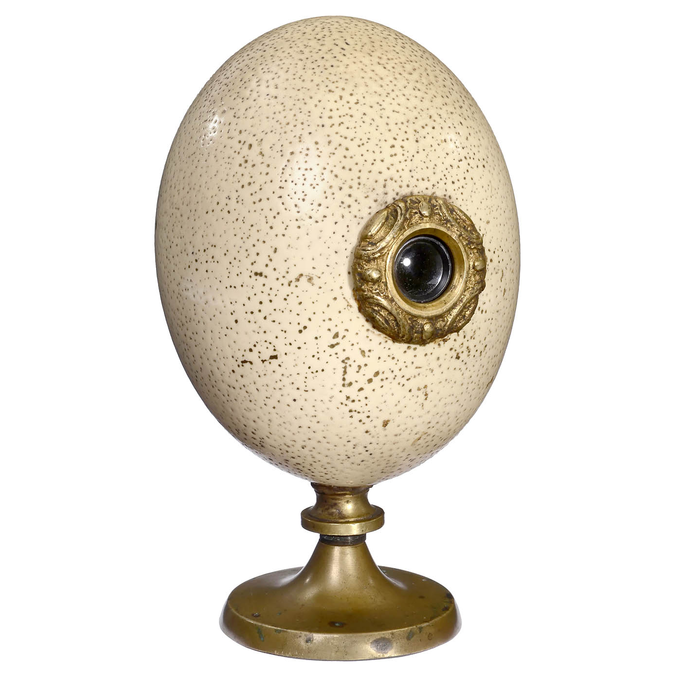 Ostrich egg with beautifully structured surface, on brass mount with 47 mm magnifying lens for viewing the scene hidden inside, a photograph of a lesbian couple, possibly signed in the base (mark illegible), egg 15.5 cm, ht. with mount 21 cm, good condition. An extremely rare and decorative exhibition piece.