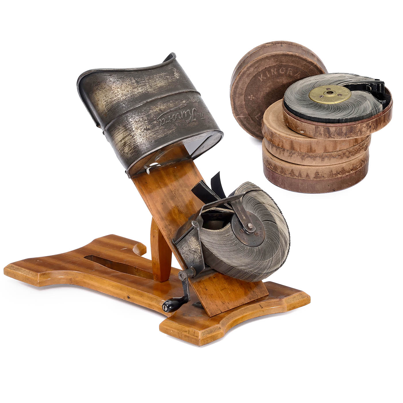 Kinora Ltd., London. Viewer on shaped wood base, metal hood, with reel no. 246 (Balloon hit by lightning), no. 79 (launching the lifeboat), no. 127 (Skirt Dance), no. 38 (coachs procession) and no. 342 (children running). In good working condition!