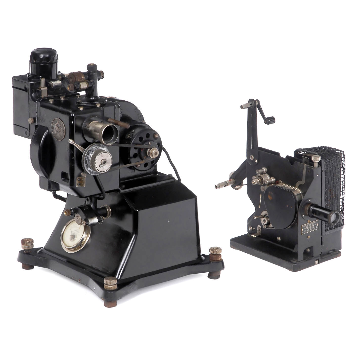 Pathé, Paris. No. 25036. Rare head of a film projector for 35mm films from the early days of cinematography in Europe. Original Pathé brass lens with rack and pinion. Step-by-step mechanism with Maltese cross. With original hand crank and front diaphragm. The projector head is fully operational and complete. A carrier of the sprocket must be screwed on again. Lots of brass parts! A wood plate (hobbyist part) must be removed. – In addition: 16mm Pathé projector from 1932 and 16mm Kodascope C projector, untested.