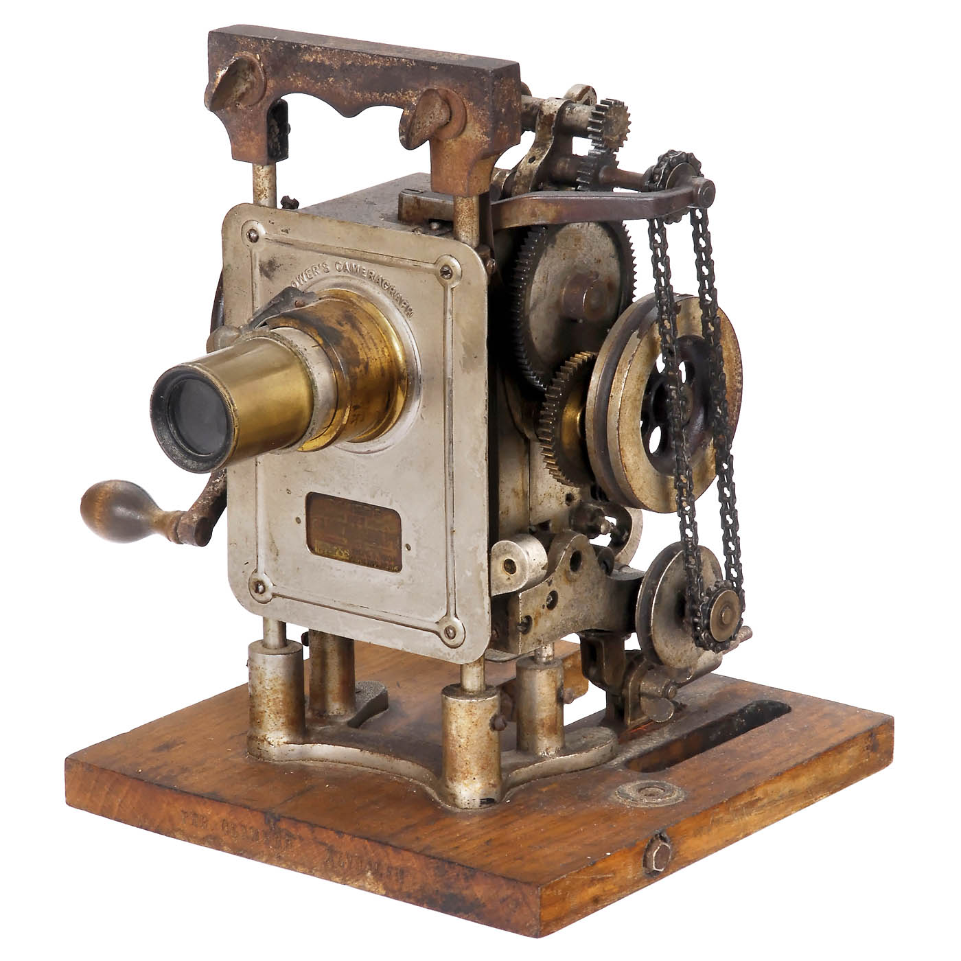 Powers, USA. Projection head from the early days of cinematography in the USA. Lens: Pathé Frères f = 35 mm. Brass frame with rack-and-pinion drive. Step-by-step mechanism: Maltese cross driven by a hand crank. Construction: steel (nickel-plated) mounted on hardwood panel. The head, equipped with an inner diaphragm, is complete and functional. Frontal lettering: Power's No. 5, Cameragraph, "Pats" Nov, 1, 1905, July, 17, 1906 No. 1758. Brass plate on carrier plate: Massachusetts, District Police. Moving Picture Machine Approved No. 468. The designer was the American film pioneer Nicholas Powers 1854–1921. – Rarely offered.
