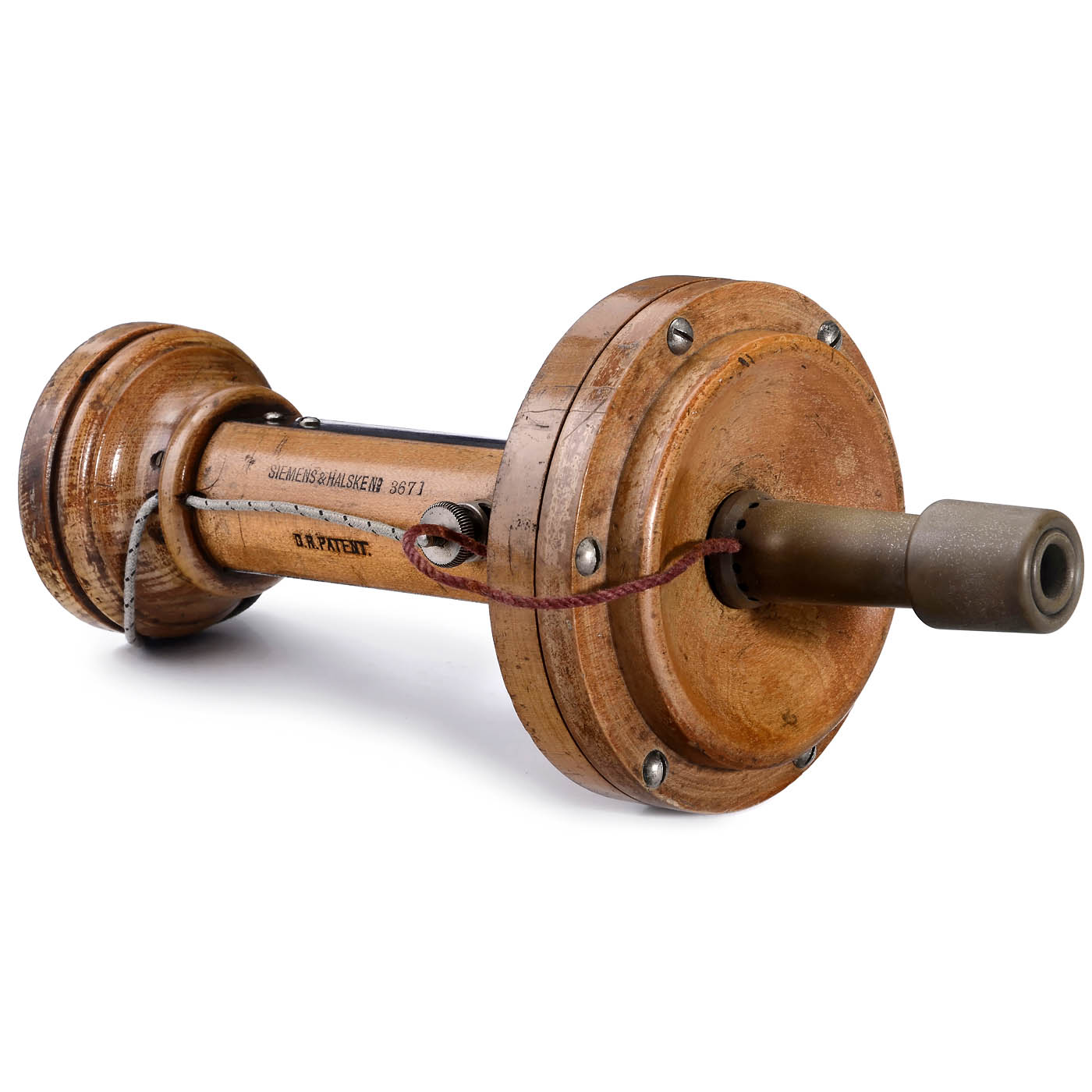 Siemens & Halske, Berlin. D.R. Patent, no. 3671, stamped "1528U – 205E", with whistle for calling, turned wood, lateral screw for fine adjustment, height without whistle 7 3/4 in. – Very rare!