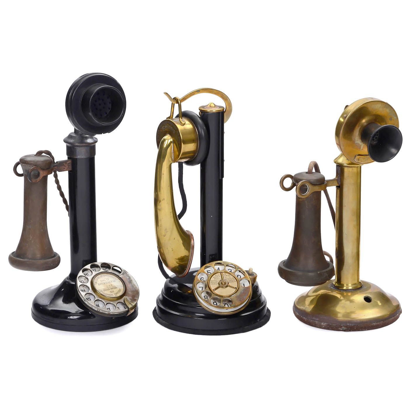 1) GPO No. 150, England, with no. 22 bakelite microphone and dial. – 2) Thomson-Houston, France. Bakelite, with dial, brass handset with speaking horn. – And: 3) Western Electric, USA. Brass, with bakelite Bell-type earphone.