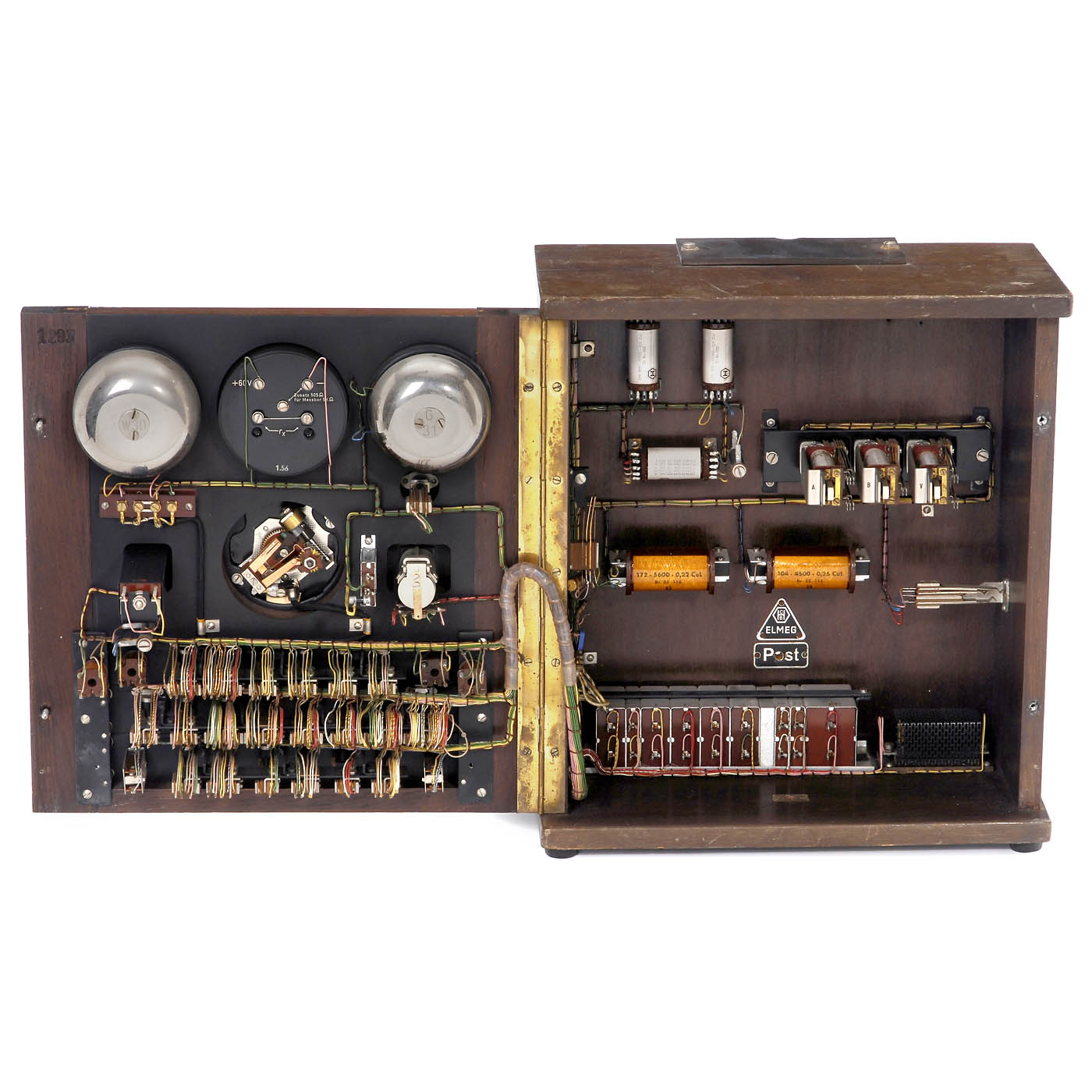 1) Cordless flap cabinet, Siemens & Halske, 13 flaps, 9 plugs, crank inductor, bakelite handset, alarm clock with switch, c. 1930. – And: 2) Test center BP 69, Elmeg, ohmmeter, dial, counter, 1 flap, 20 switches, bakelite handset with talk button, oak case, c. 1955.
