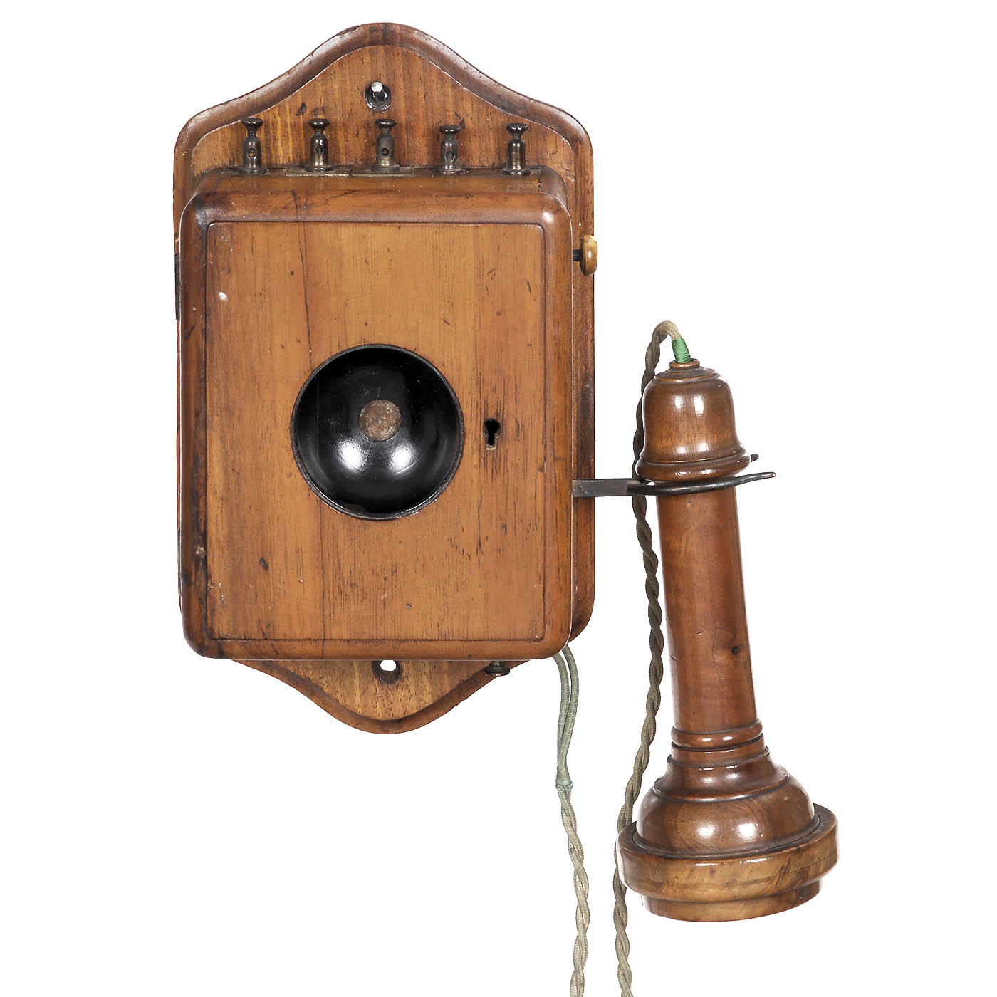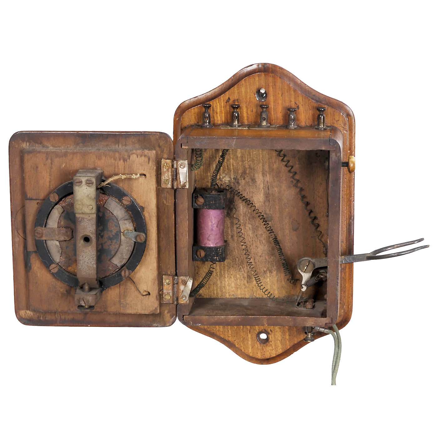 De Jongh, Brussels. Walnut case, transmitter with metal plate, platinum contact and carbon contact, turned walnut Bell-type earphone. – Note: The Blake transmitter was the first successful telephone microphone and was made under license by companies across the world. An invention with iconic significance to collectors today.