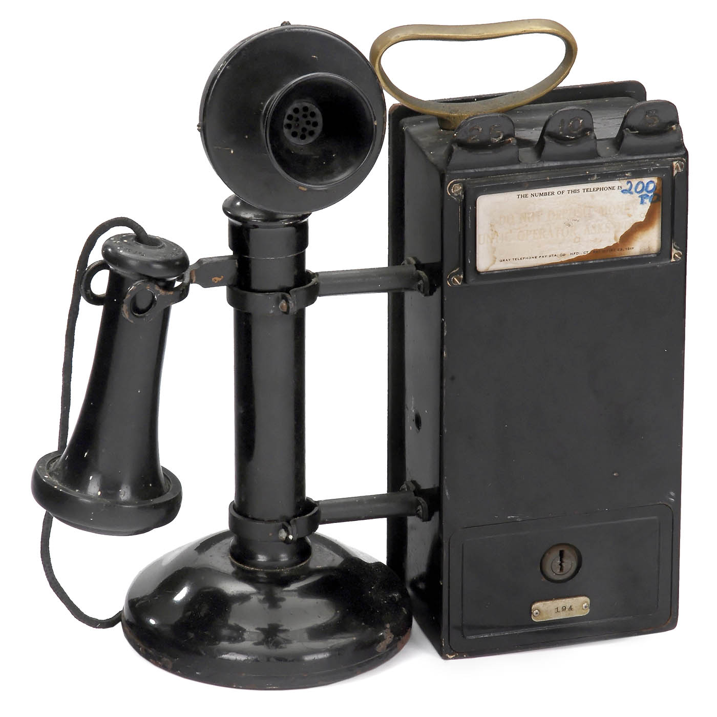 American candlestick by Western Electric, an upright desk set equipped with an early 3-slot coin box from the Gray Telephone Pay Station Company. Height 11 ¾ in., with lock and key. – A rare early pay phone!