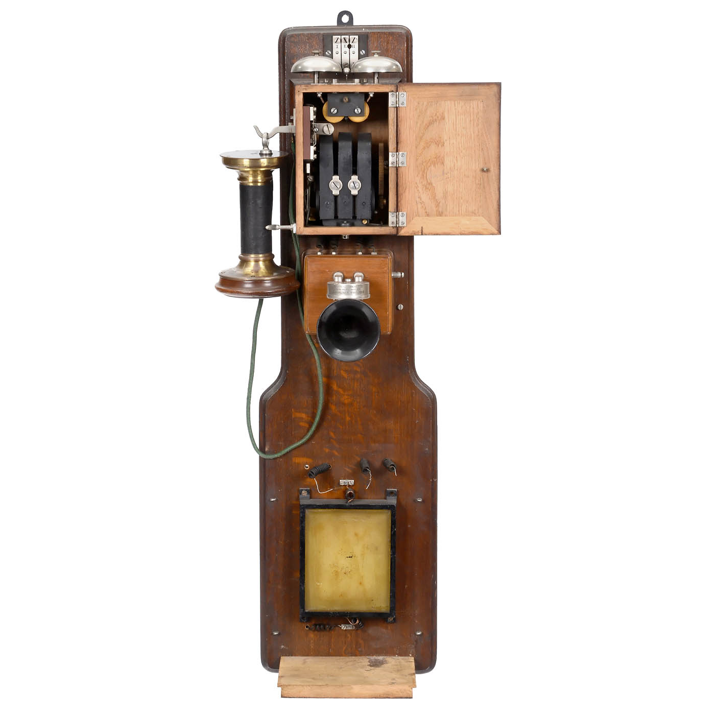 Telegraphenwerkstätte der Königlich württemberg-ischen Generaldirektion der Posten und Telegraphen. Three-part case, receiver by Siemens & Halske, underside stamped "47218 – 1725U – 205E", Universal Transmitter microphone by J. Berliner, three-part crank inductor, double bell, battery box, total height 36 in. Restored.