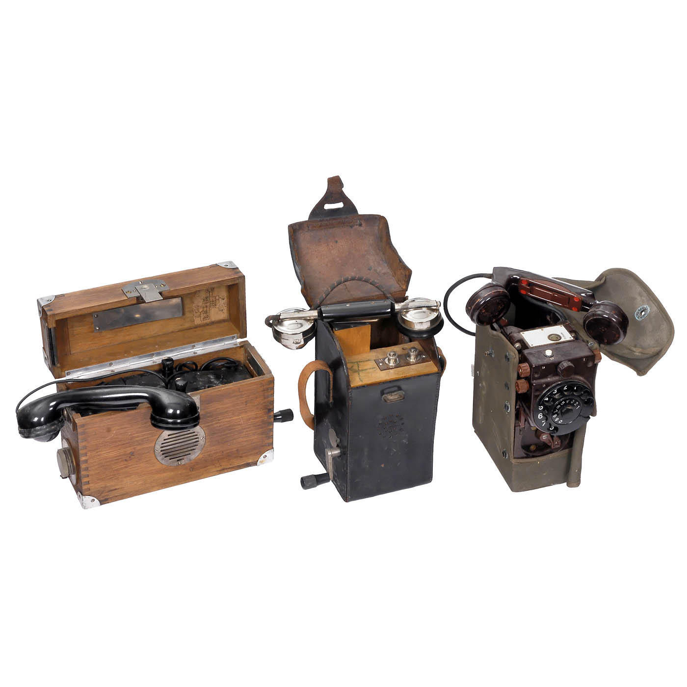 1) Field telephone, Gebrüder Kammerer Telefonfabrik, Munich, c. 1918, wood case, with metal plaque "Tragbarer Fernsprecher OB für Flugwachen". – 2) M 15-line telephone, A. & R. Kammerer Telefonfabrik, Munich, 1939, handset with speaking horn, wood case. – 3) 2 x SF 882-line telephones, Krone GmbH, Berlin, c. 1969, bakelite case, in linen cloth bag, 1 with number switch. – 4) Test telephone, Siemens & Halske, Berlin, c. 1930, in leather case. – 5) Field telephone, Siemens & Halske, Berlin, c. 1940, wood case. – 6) Portable line testing apparatus, Siemens & Halske, Berlin, c. 1920, early number switch, wood case. – And: 7) Test apparatus, Friedrich Reiner, Munich, c. 1925, handset with speaking horn, dial, wood case.