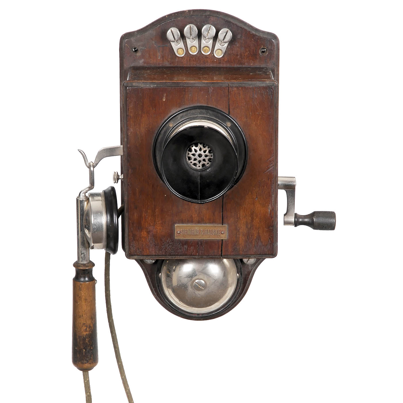 1) M85, walnut case by Gebrüder Naclo, Berlin, no. 2105, mechanical parts by Siemens & Halske, 3-part crank inductor, carbon barrel microphone (renewed), double bell, spoon-shaped receiver by Siemens & Halske. This telephone was rebuilt by RTV in 1895. – And: 2) Siemens & Halske, c. 1905, walnut case, microphone with speaking horn, spoon-shaped receiver, 2-part crank inductor.