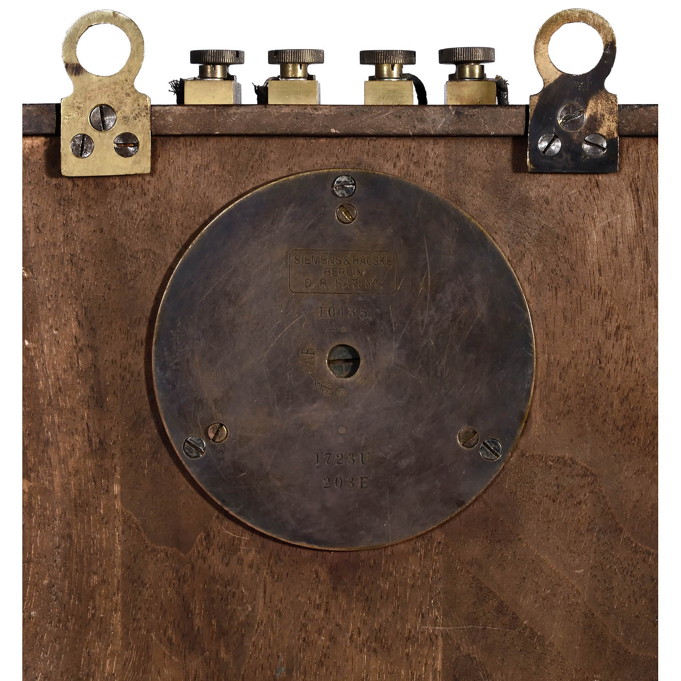 Siemens & Halske, Berlin. With butterstamp receiver, D.R. Patent, underside stamped "10136 – 1723U – 203E", turned wood and brass, leather-covered handle, underside with screw for fine adjustment, height 7 ½ in., identically constructed microphone in the case, lightning protection, single bell, walnut case. The first commercial wall telephone by Siemens & Halske, a huge rarity. Restored.