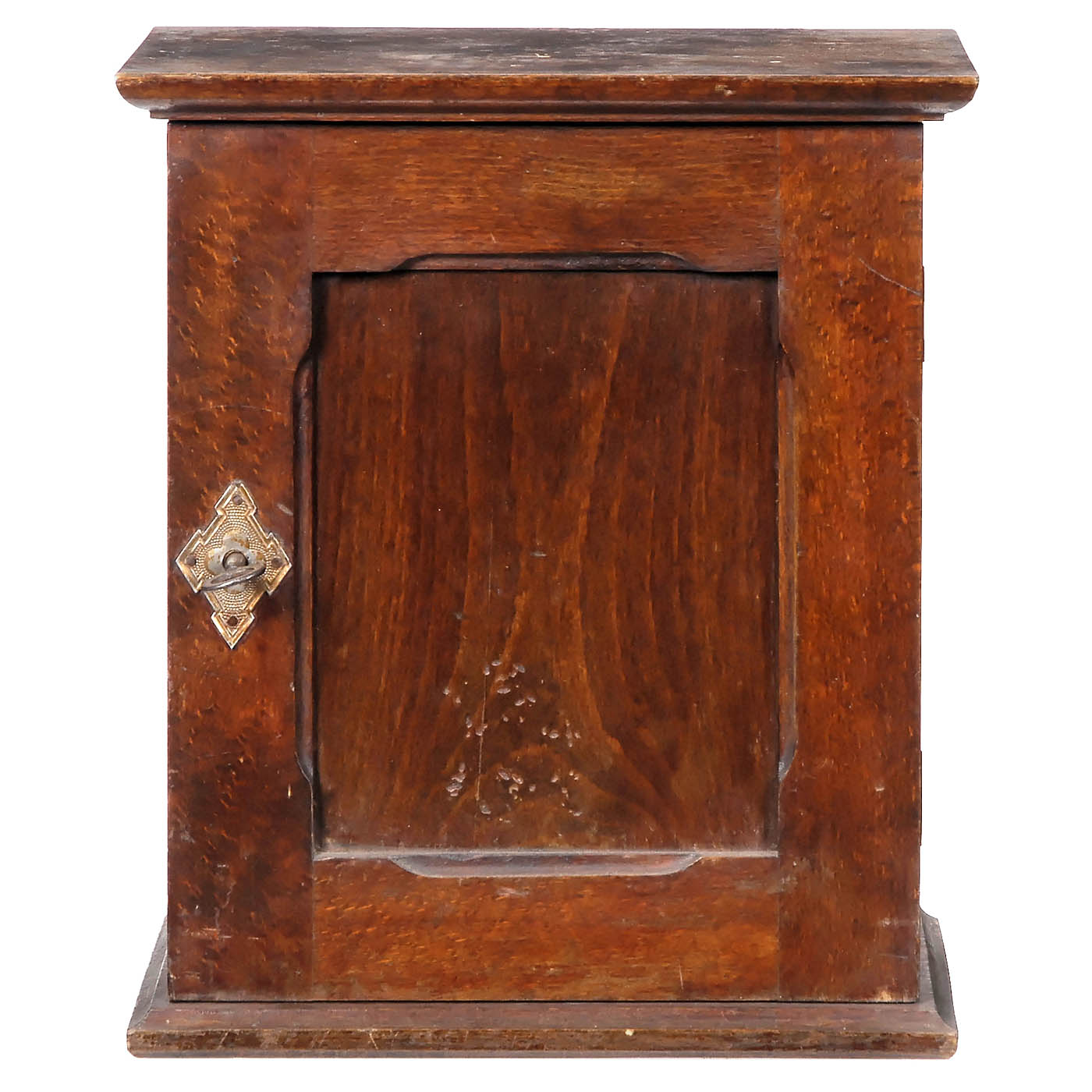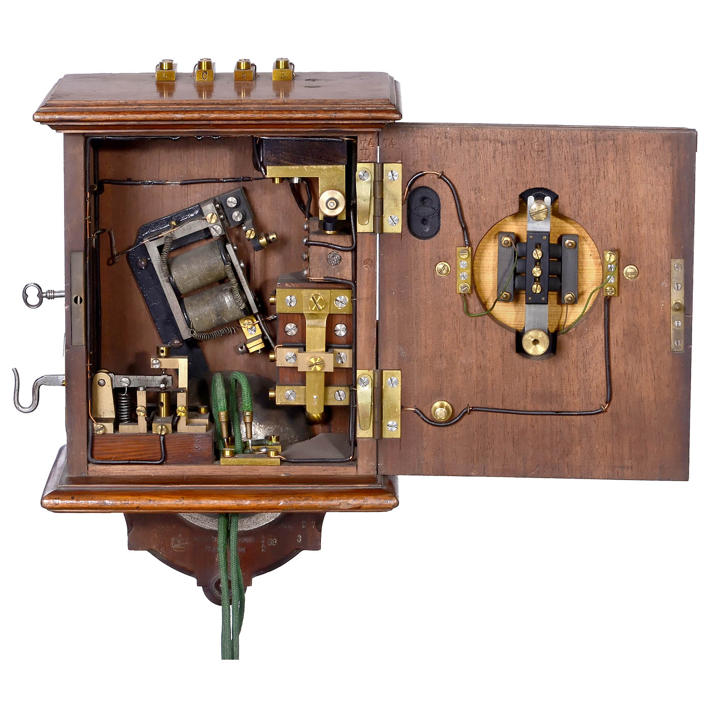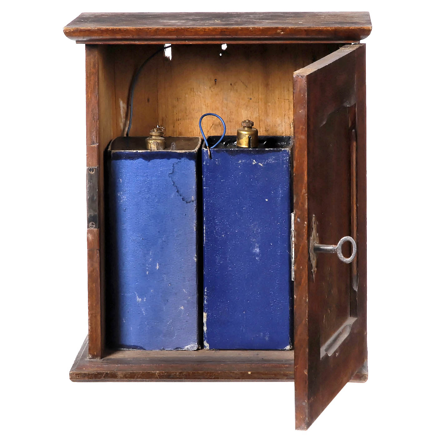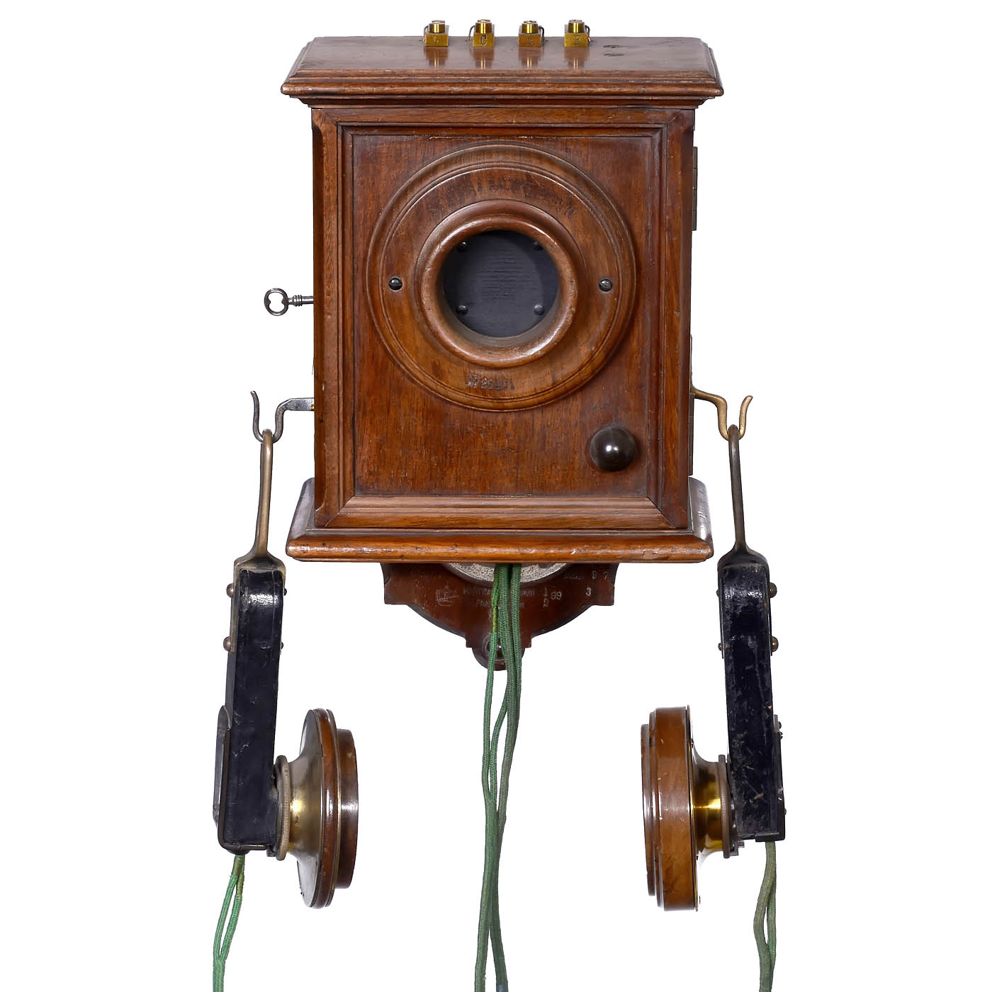Polished walnut case, serial no. 36136, carbon pencil transmitter with wood membrane, 2 Siemens & Halske earphones, serial nos. 22388 and 22260, with key. – In addition: Separate battery case with 2 dry batteries. Restored.