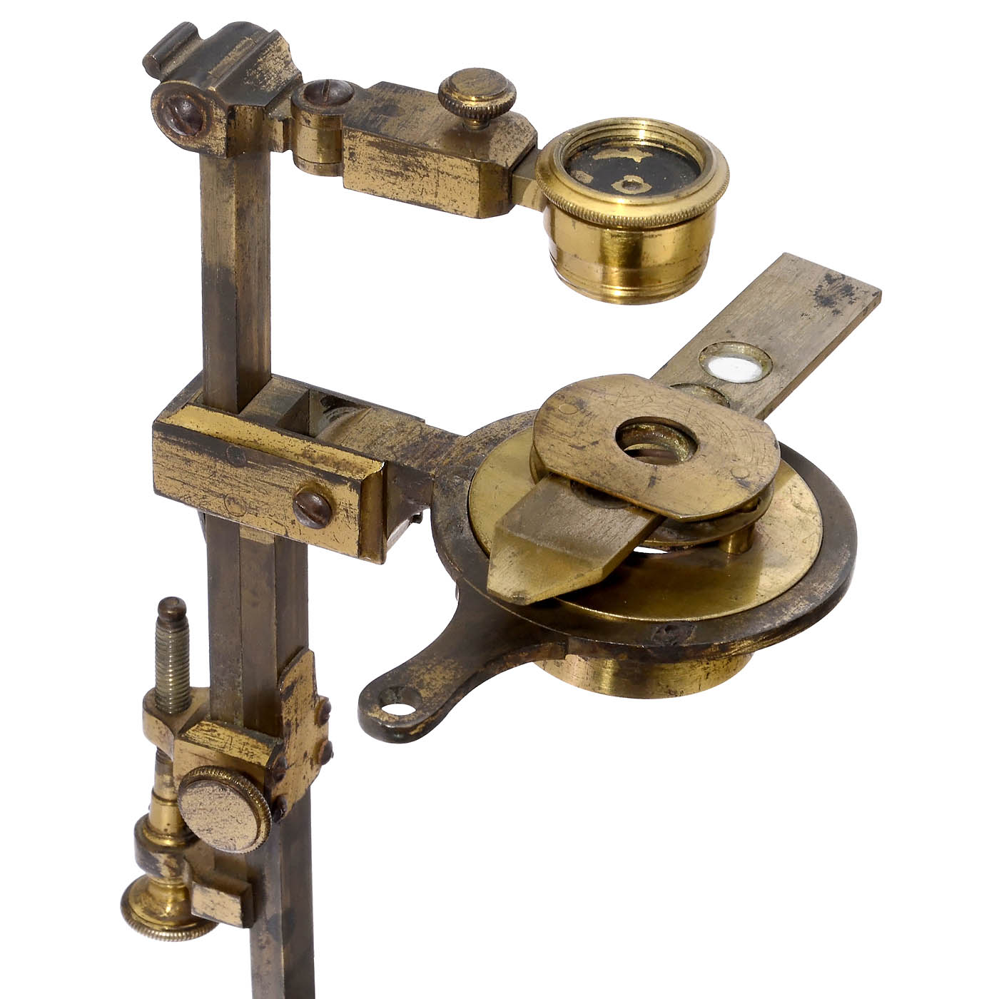 Unsigned, probably Jan Paauw Jr., Leyden, Netherlands, original lacquered brass, oval baseplate screwed to solid mahogany base (damaged), folding mirror, stage and ocular arm, coarse adjustment by sliding the stage, thumbscrew-adjusted Hevelius-type fine focusing to the rectangular pillar, height without base 8 ¼ in., with Bonanni spring-stage, 7 lenses with bone caps, Lieberkuhn und 2 specimen sliders (1 x brass, 1 x bone), in fitted black shagreen-covered wood case with green velvet lining.