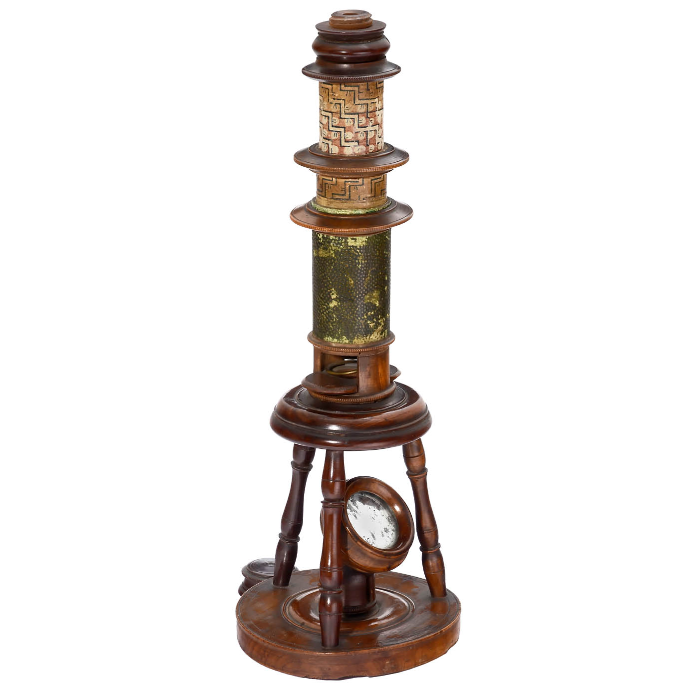 Culpeper-type, fruitwood, 4 ¾ in. circular base (missing feet), 3 ¼ in. stage plate supported by three turned legs, outer tube covered with fishskin-patterned paper, draw tubes covered with paper, base branded "IM" in circle, screw-on dust cap on eyepiece, 1 lens, single mirror on wood hinge, height 12 ½ in.