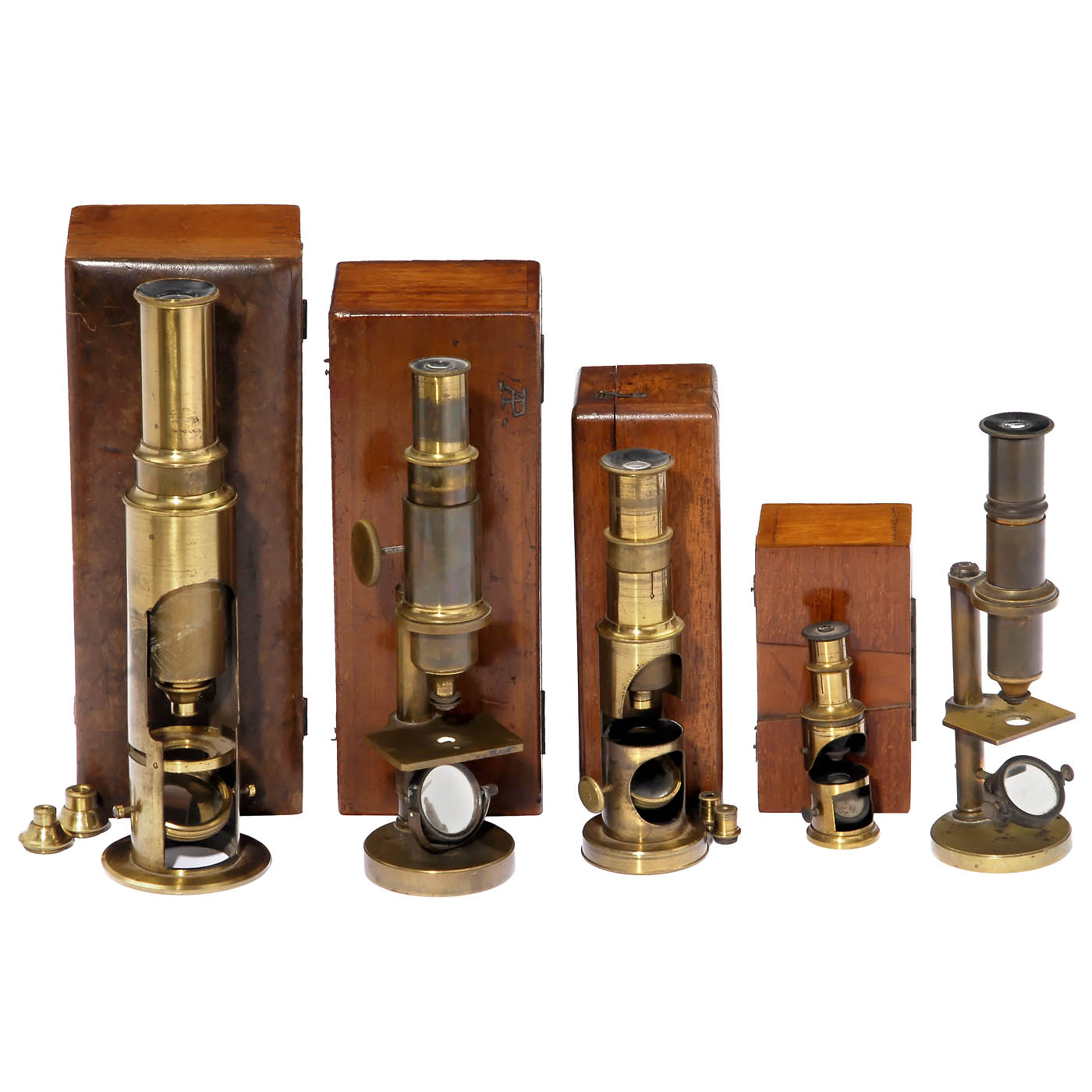 1) Drum microscope, England, unmarked, c. 1860, concave mirror, 1 eyepiece, 3 objectives (Nos. 1, 2 and 3), height retracted 8 ¾ in., with livebox and bone slide in case. – 2) Small student's microscope, c. 1900, round base, single mirror, sliding tube, 1 eyepiece, 1 objective, height retracted 6 ¾ in. – 3) "Furnace" by Bertrand, Paris, c. 1875, miniature drum microscope, height only 3 ¼ in., in walnut case, lid with dovetailed slot for the base of the microscope. – 4) Unmarked, Germany, c. 1900, round base, single mirror, rack-and-pinion adjustment, 1 objective, 1 eyepiece, height retracted 7 ½ in., in mahogany case, lid with paper label "Mechanisches Institut von Landsberg & Wolpers in Hannover". – And: 5) Small drum microscope, unmarked, ca. 1890, single mirror, 1 eyepiece, 3 objectives, height retracted 6 in., with 3 ebony slides in mahogany case.